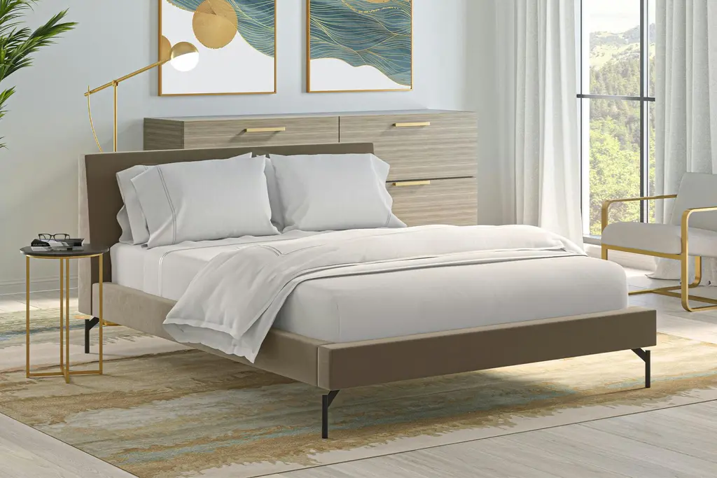 The Rhodes is a companion bed frame to our ever-popular Santorini. It boasts the same sleek, sophisticated lines, updated with a taller headboard and modern matte brass legs. No foundation or box spring required.