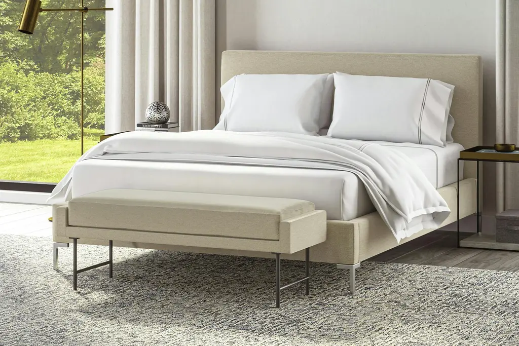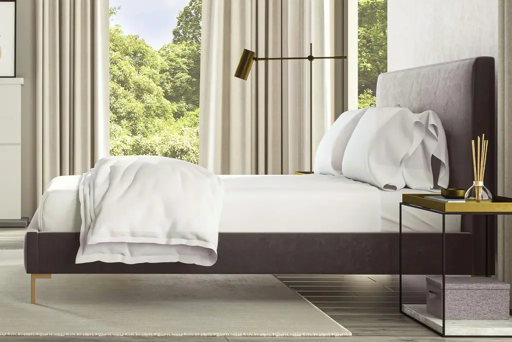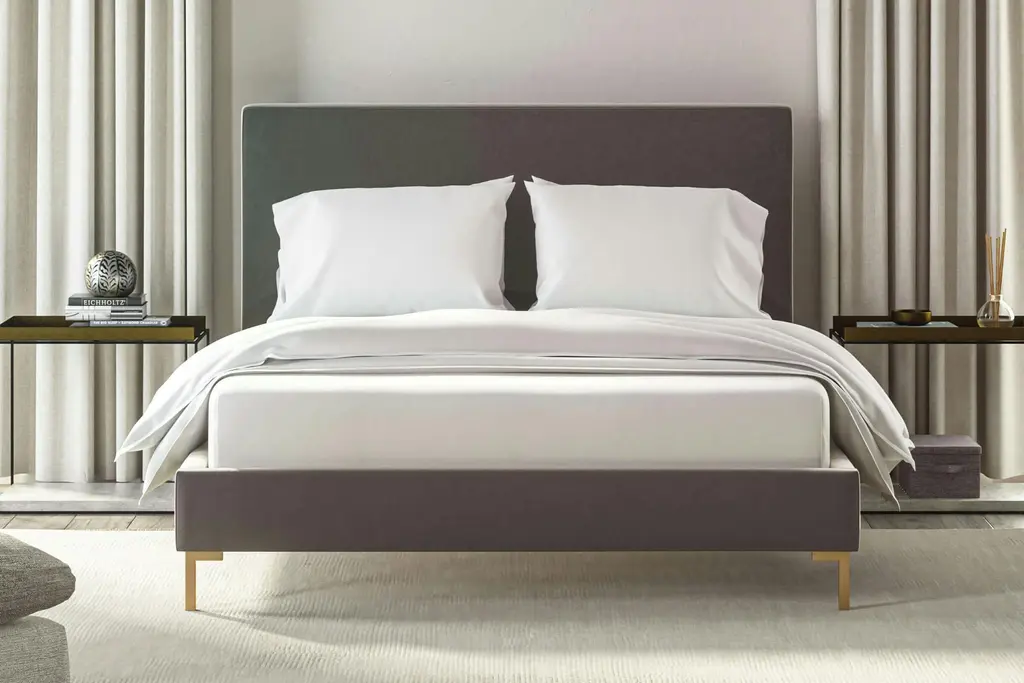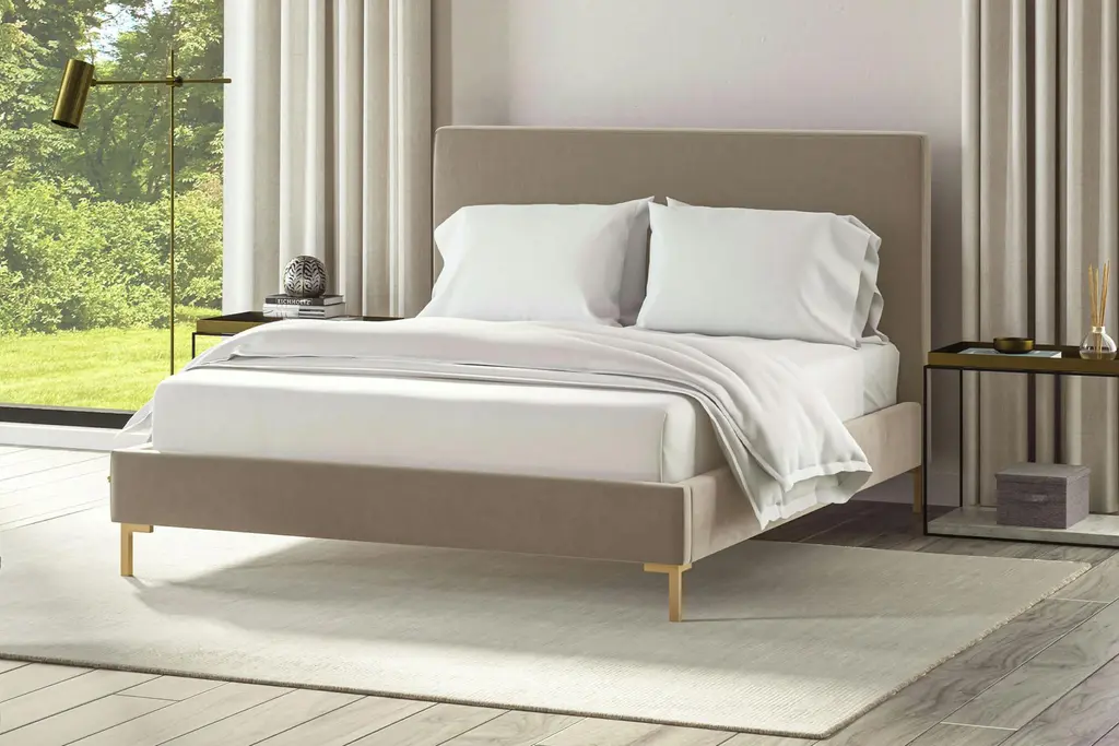 The Rhodes is a companion bed frame to our ever-popular Santorini. It boasts the same sleek, sophisticated lines, updated with a taller headboard and modern matte brass legs. No foundation or box spring required.
