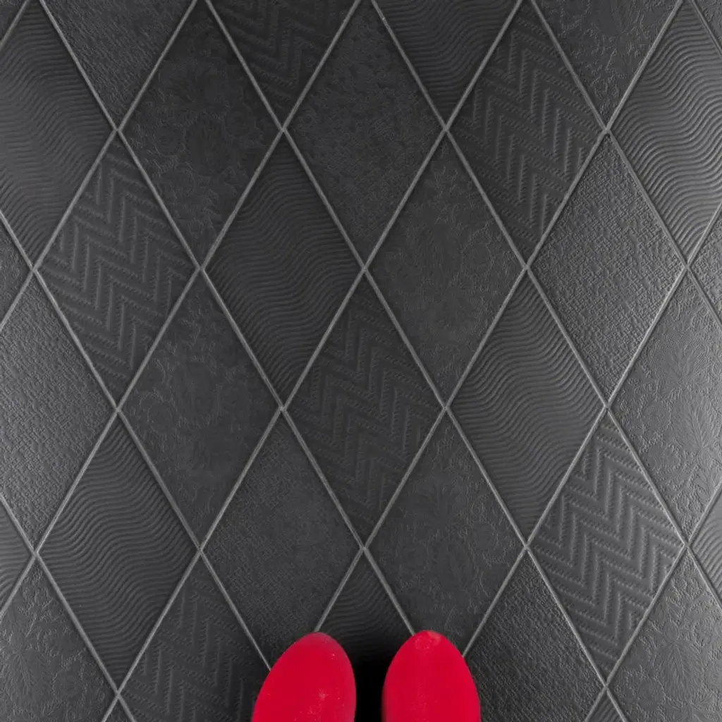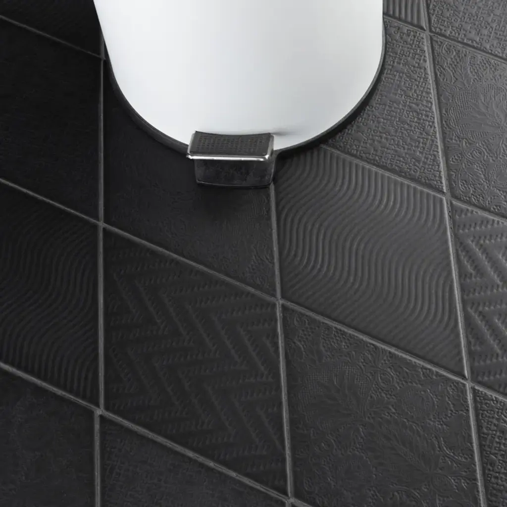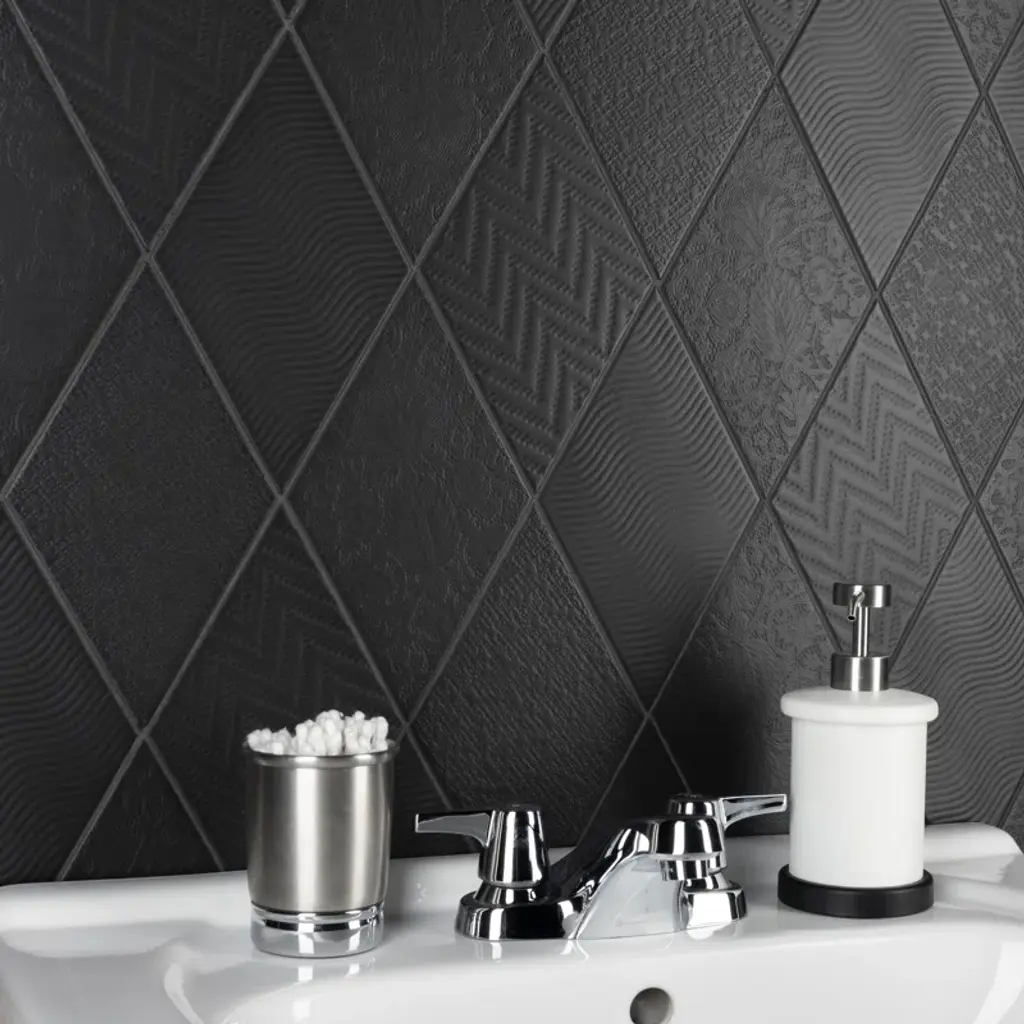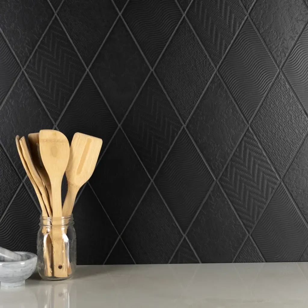 Bring a modern, geometric look to your home with the Rhombus Black 5-1/2 in. x 9-1/2 in. Porcelain Floor and Wall Tile. This diamond-shaped tile features four unique patterns, including waves, zig-zags, floral lace and letters. The medium sheen black glaze offers a contemporary look for any installation. The unique shape of these tiles allows you to create endless layouts and designs. This slip resistant tile is great for most residential floors, including kitchens, showers and entryways. Look at the different color options in the series that coordinate to add definition and design to your living space.