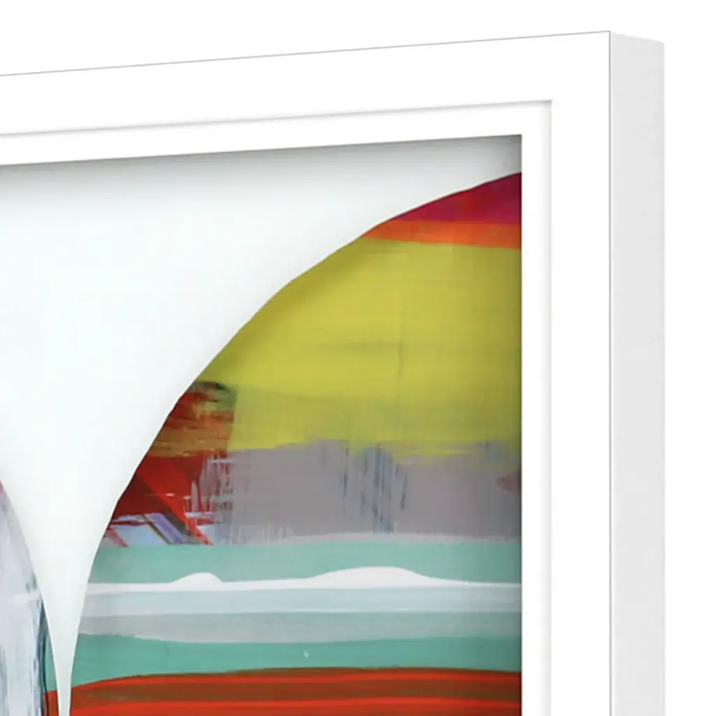 Exclusive mixed media shadow box with reverse hand painted glass overlay. Framed in a lacquered white wood shadow box style moulding.