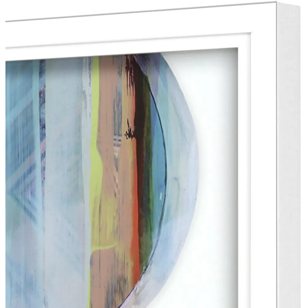 Exclusive mixed media shadow box with reverse hand painted glass overlay. Framed in a lacquered white wood shadow box style moulding.