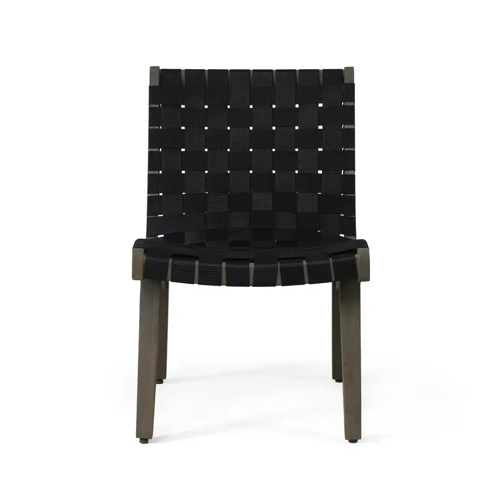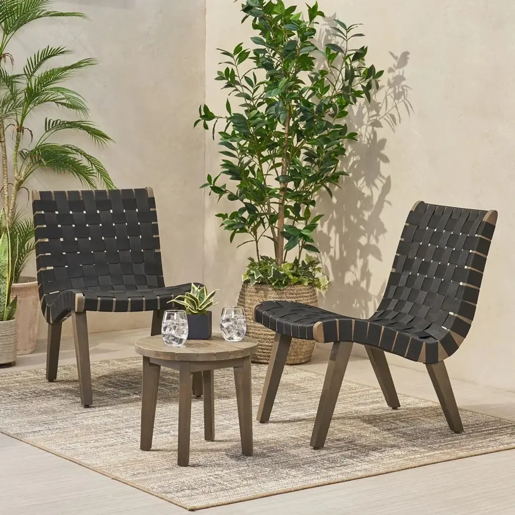 Embrace outdoor relaxation with this stylish 3-piece chat set, featuring two curvaceous chairs and a slatted table. The chairs boast an intricate rope strap weave, offering both durability and a distinctive design. Crafted from acacia wood, the sturdy frames provide lasting strength and a sleek, exotic touch. This elegant set seamlessly enhances any patio or garden setting.