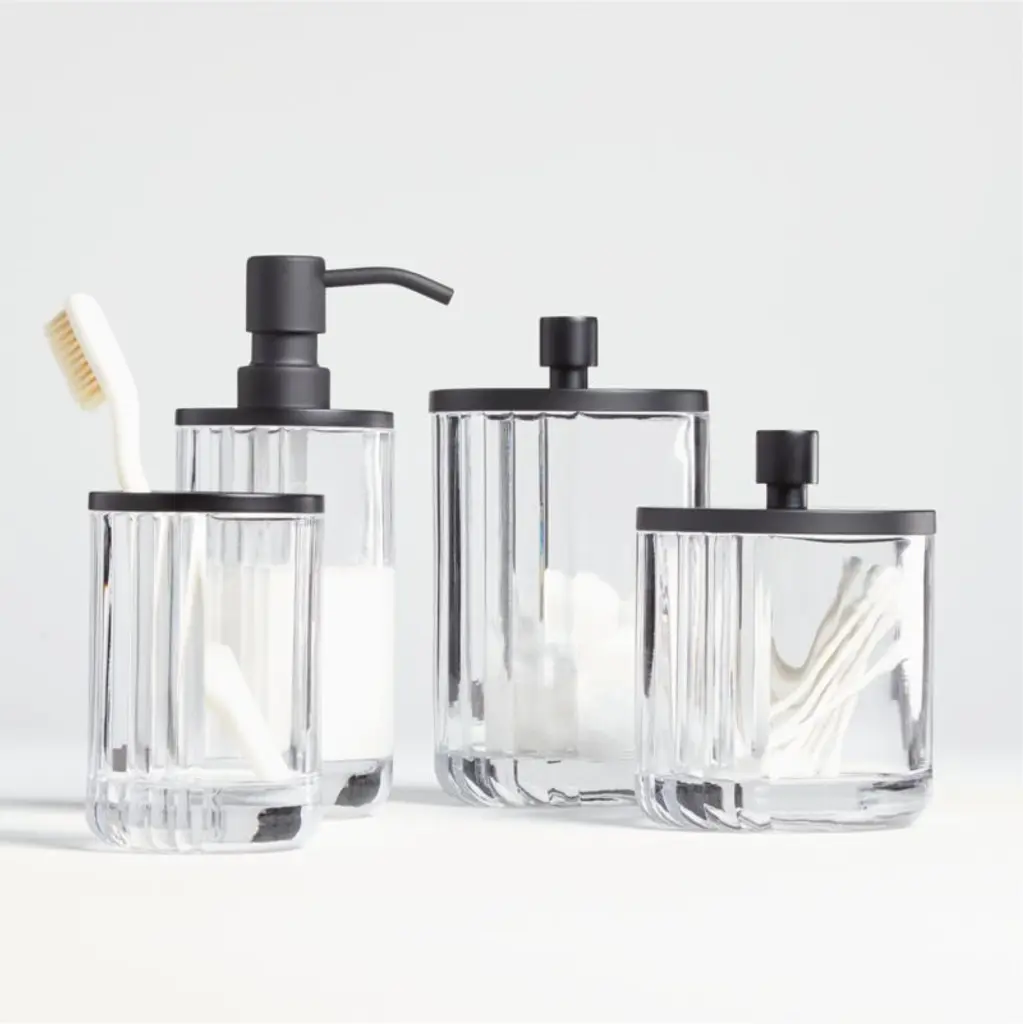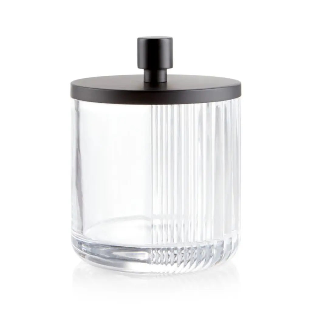 Our small glass canister elevates bathroom storage with modern optics. Transitioning from smooth to textured, the ribbed glass canister's graduated design makes an eye-catching display of everyday items such as elastic hair bands and makeup pads. A matte black lid with a bold stopper-like knob adds to the canister's stylish appeal. Complete the look with coordinating large canister, soap pump and tumbler.