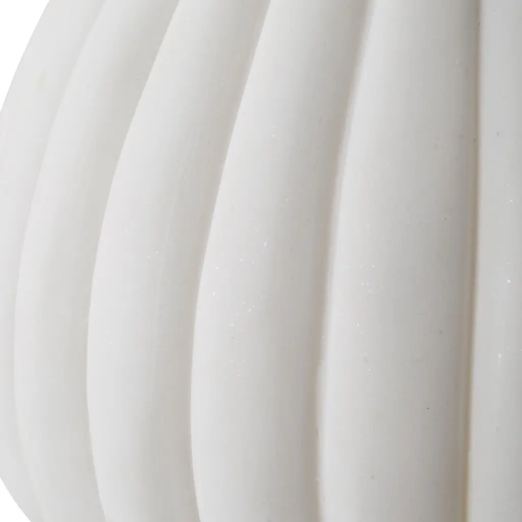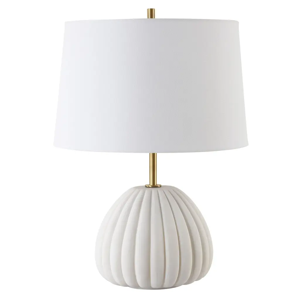 This table lamp adds an air of elegance and sophistication to any space. The body is crafted from ivory man-made stone that accurately replicates the look of Thasos marble, featuring elegant curves and deep channels, accented with plated brass details. The tapered round hardback shade is covered in crisp white linen fabric, enhancing its refined design. Perfect for elevating your decor with a blend of classic charm and modern luxury. Product Features: Decorative table lamp with white shade Elegant curves and deep channels design Accented with plated brass details Tapered round hardback shade Recommended for indoor use only Additional Features: Wattage: 150W Bulb type: type A Socket type: 3-way Dimensions: Overall dimension: 22.5" high Shade dimension: 10" high x 14" diameter Material(s): rice stone/iron/linen fabric