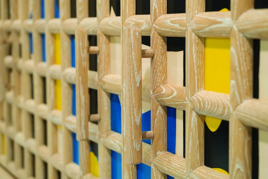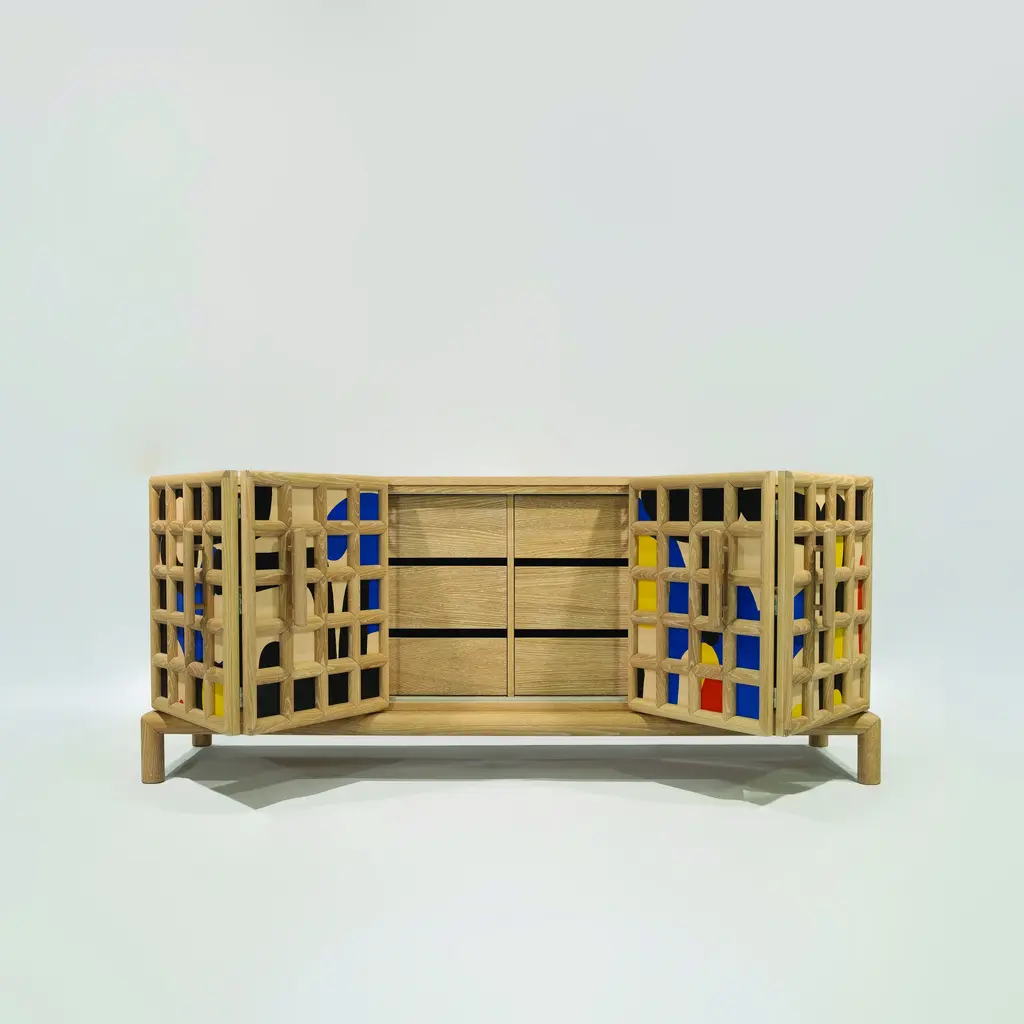 The pictorial culture that made famous Carretti Siciliani and Pupi is distilled to obtain the essentiality of color: the Ribera sideboard family uses the traditional painting technique combined with the most sophisticated joinery, to create an unexpected and surprising piece of furniture. The pickled oak wood is grafted like a grid, over backgrounds of bright colors that are softened and softened by the warmth of the wood. The packet opening of the front doors reveals an interior enriched by the same wood and an organization of the compartments that makes the furniture extremely versatile. The cylindrical section of the solid wood becomes the leitmotiv of this container, transforming itself into structure, handles or base. Vertical container with structure in pickled natural oak blockboard, base in solid wood of the same essence, doors in pickled solid oak with hand-painted bottom panel.