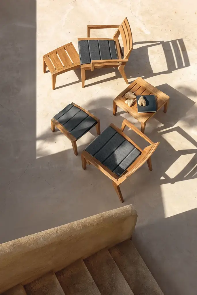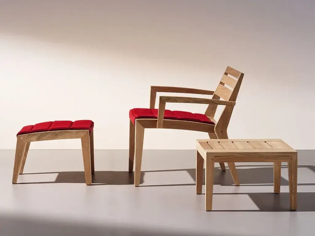 Ribot is a lounge armchair in natural teak. It can be completed with a removable footrest that transforms the seat into a relaxing chaise longue.The Ribot family was created to offer the private and contract world a choice of multi-purpose, durable teak chairs specific for outdoor use. The Ribot range is extended with the armchair designed for lounge situations enriched with a removable footrest that transforms the seat into a relaxing chaise longue. The design of the dining and lounge seating is completed with a cushion that becomes an integral part of the structure and which, with the new red Navajo, yellow and espresso, enhances the warm and blonde tonality of natural teak. The elegant and minimal design of the collection reveals the constant attention of Ethimo to the details and trends of contemporary outdoor living.