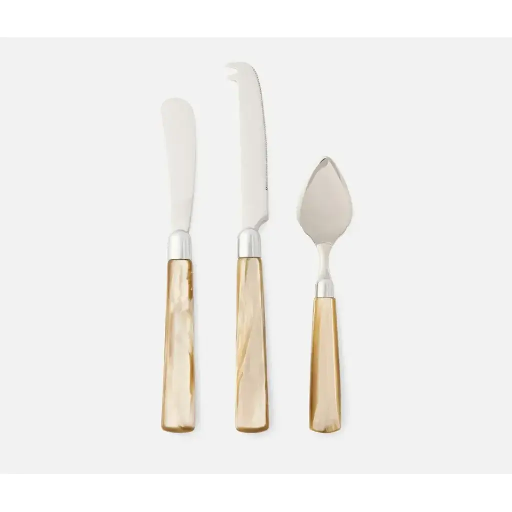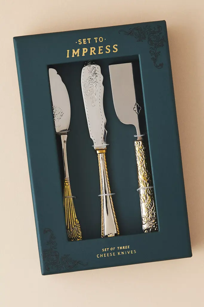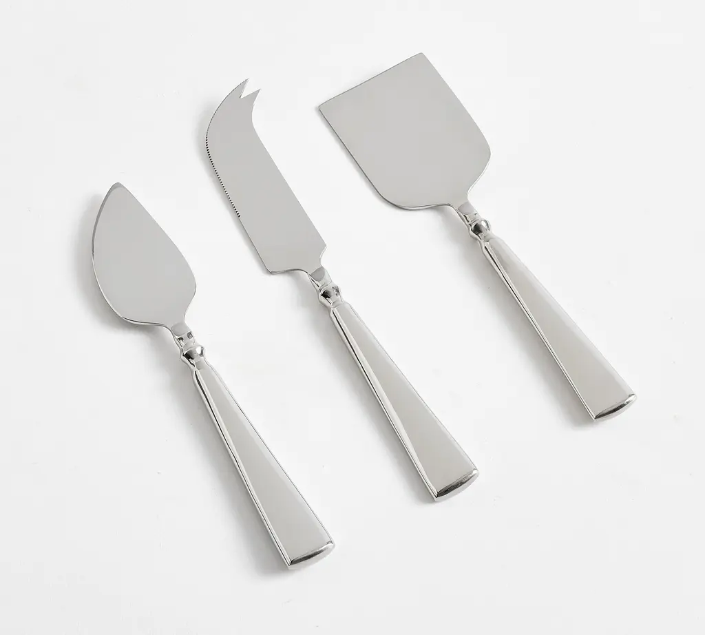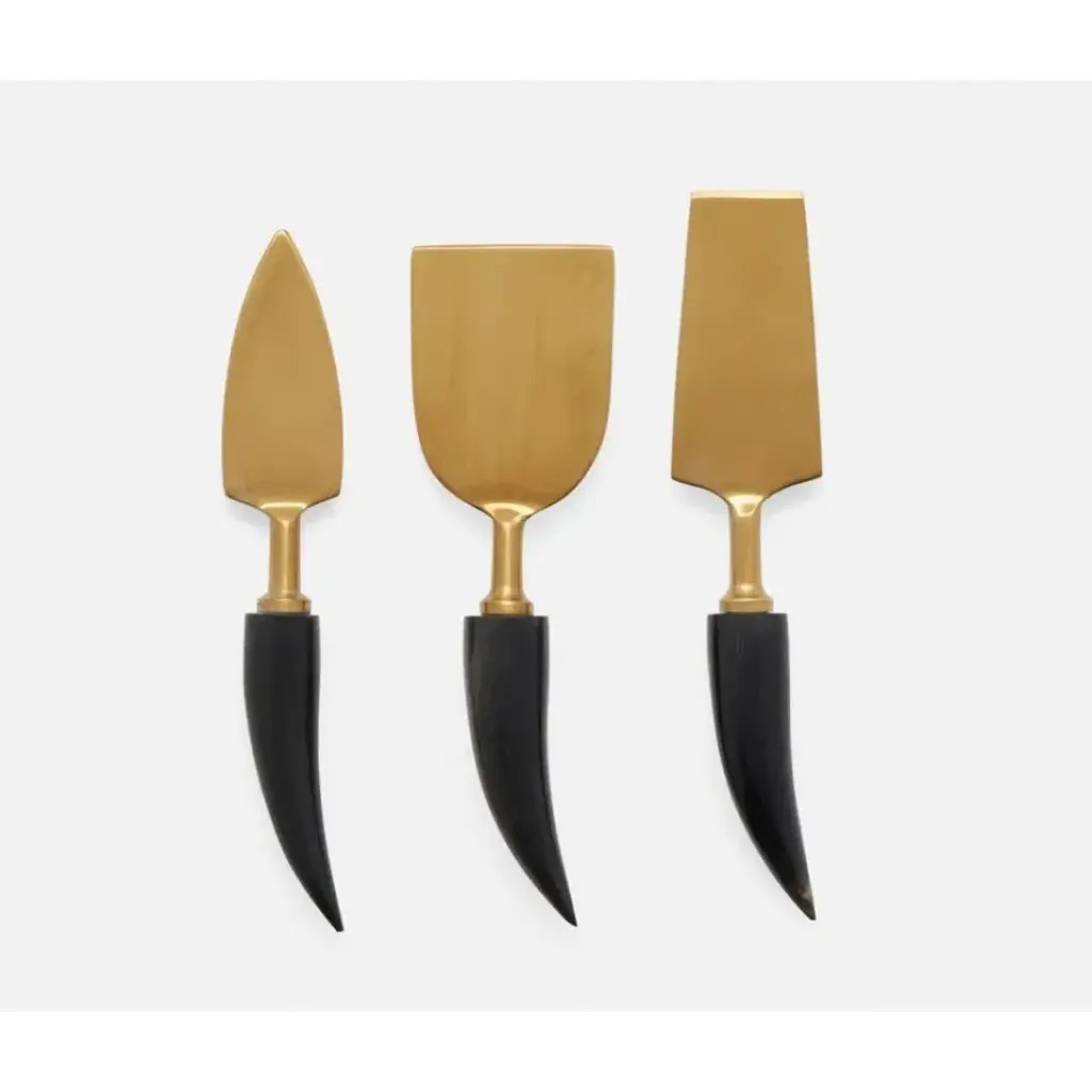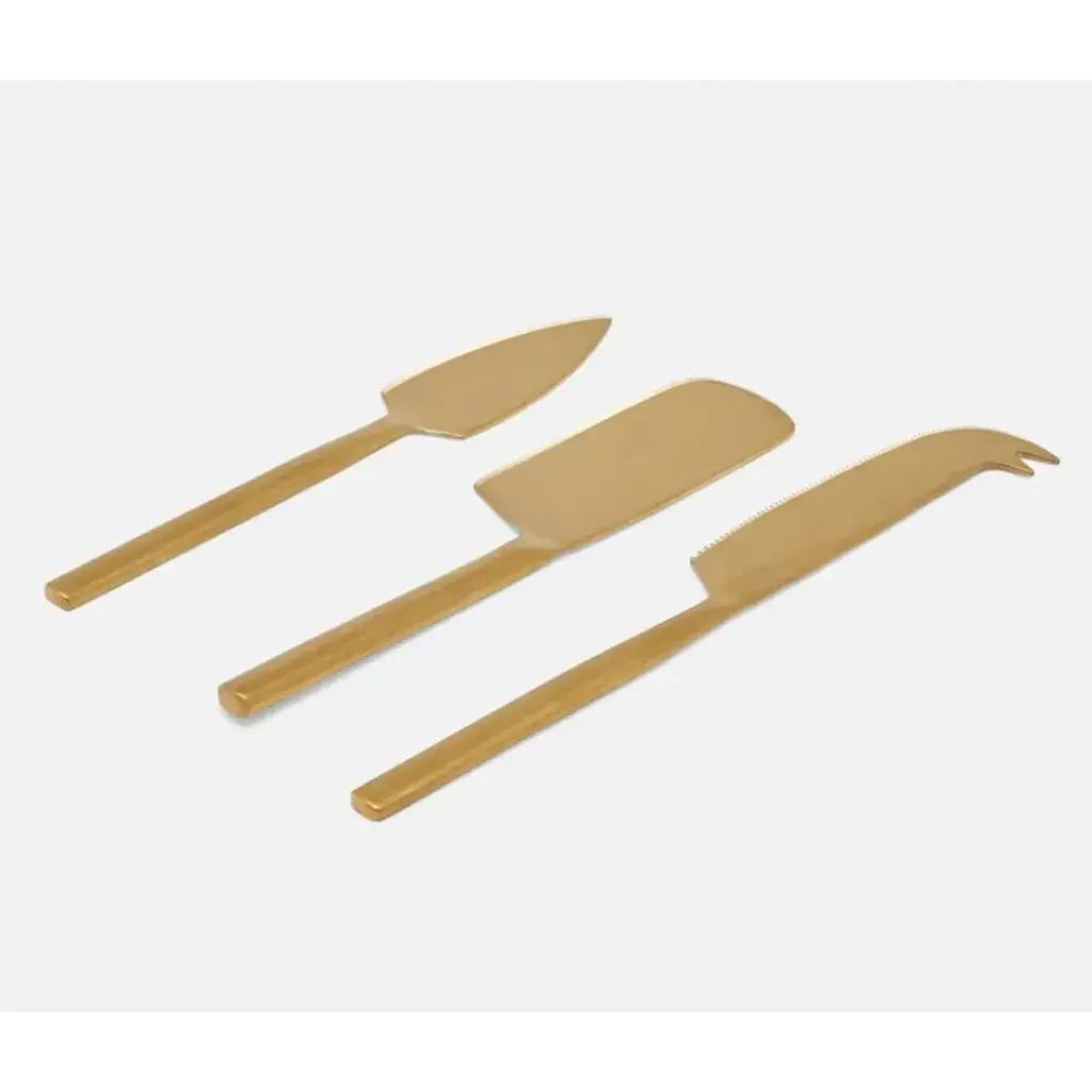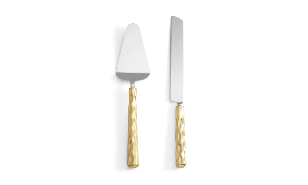 Ornate designs cascade from the brass handle onto the stainless steel heads of this serving collection, evoking a classic elegance for your table, cake stand, or cheeseboard.