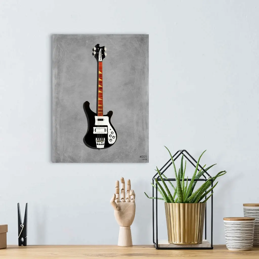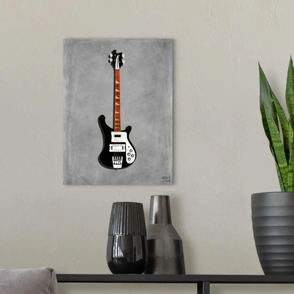 Photograph of a Rickenbacker 4001 1979 printed on a textured background in shades of gray.
