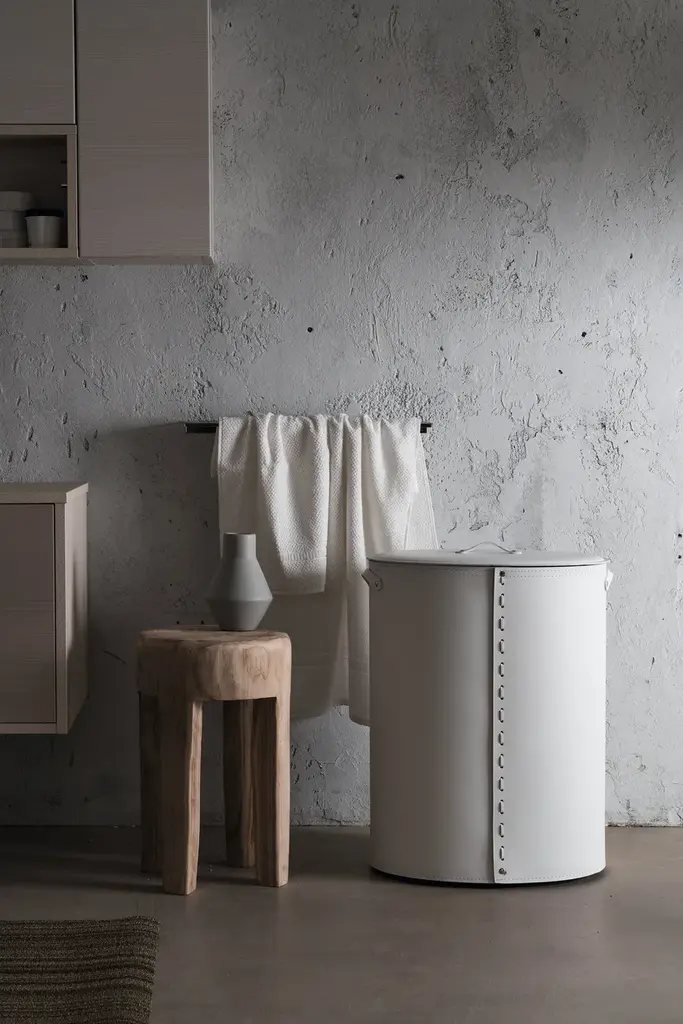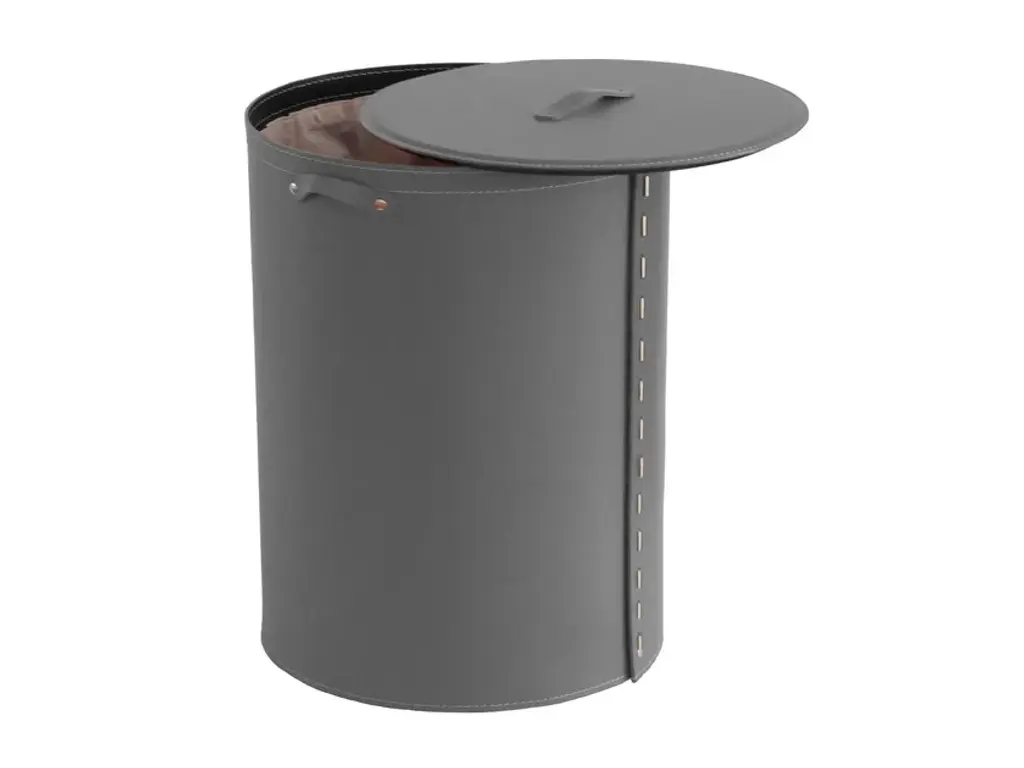 Oval Laundry Basket made in regenerated leather with removable inner bag in pure cotton. Structure in leather covered plywood with rubber feet.