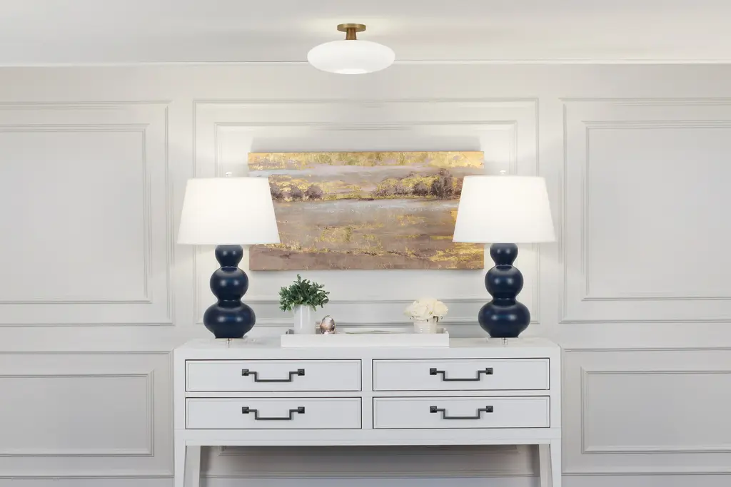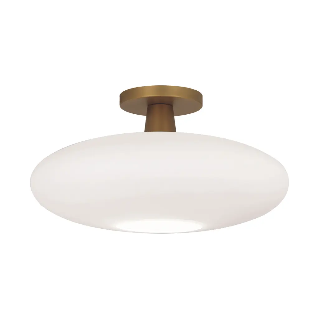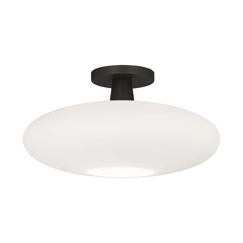 The Rico Espinet Ovo Semi-Flushmount from Robert Abbey combines modern design with subtle retro flair. Its compact metal suspension complements low ceilings while accentuating the elegant curve of the oval glass shade. The opaque glass diffuses light softly, reducing glare, and directs a clean downlight through its circular opening, creating a warm and inviting ambiance. This fixture sharpens any room’s style with sophisticated simplicity. Highlights