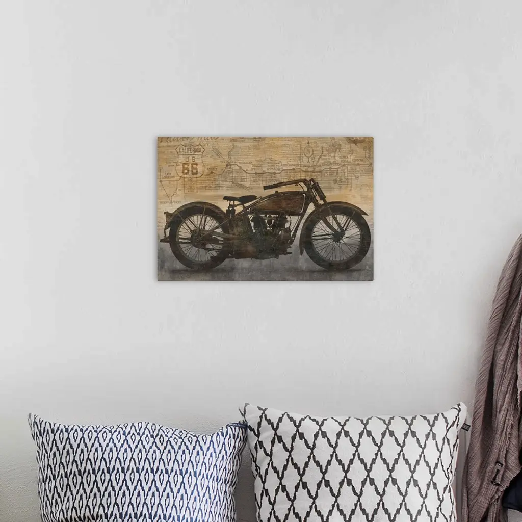 Vintage decor with an illustration of a motorcycle and a California US 66 map in the background.