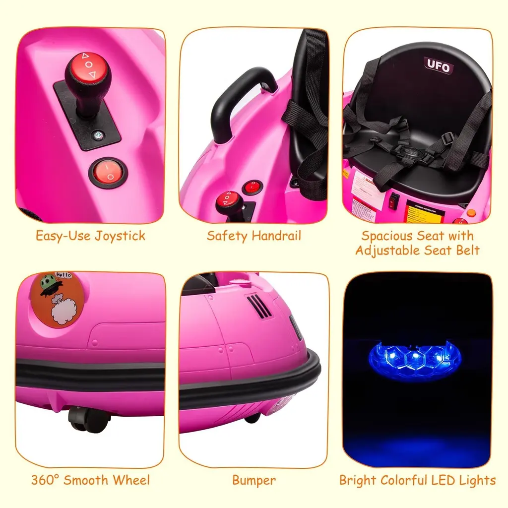 Powerful Motor: Kids Bumper car is powered by a 12V battery and features a robust motor(25Wx2) that allows kids to drive comfortably on various terrains. Safe and Soft Bumper : Bumper car has passed safety tests and is equipped with soft anti-collision strips to protect children from injuries. The ergonomic backrest, seat, adjustable safety belt, and anti-slip footrest ensure a safe and comfortable driving experience. 360° Degree Spin Wheels: The ride-on bumper car features a Slow Start Function for comfortable. It has 2 directional wheels and 2 swivel wheels for smooth movement and flexible turns on various road surfaces. Two Operating Modes: Kids can control the bumper car using dual joysticks, enhancing their hand-eye coordination and gross motor skills. Parents can also use the 2.4G remote control for added safety and control. Endless Fun for Children: With its durable construction and eye-catching design, this ride-on bumper car provides endless fun for kids. It helps enhance their strength, endurance, coordination, and provides outdoor entertainment for their growth.