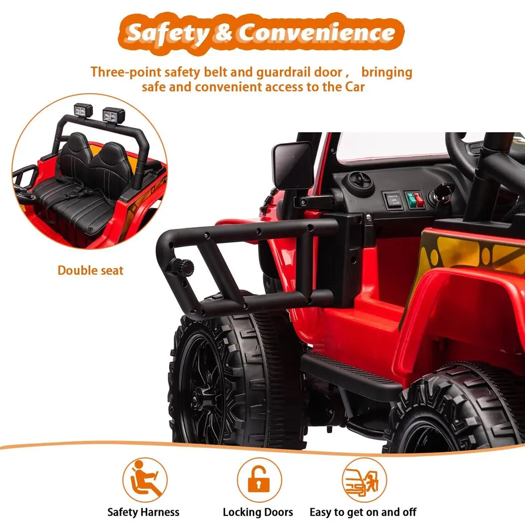PARENT-CHILD CAR - upgraded version of the extended body, reinforced rear seat support plate can sit adults. Cool and domineering, full off-road style, take your baby and enjoy cross-country. UPGRADED & ENLARGED BATTERY DESIGN - Our ride car upgraded battery design, long-lasting range more durable, removable battery, easy to put forward charging, more convenient and safe! REALISTIC DRIVING ACTION - Give your kids a realistic behind-the-wheel experience with controls sized for small hands and a powerful 12V battery that runs up to 2 hours on a full charge. SAFETY & INTERESTING - Includes plastic wheels, safety belts with locking doors, and a safe 3.7mph max speed for smooth cruising around the house. Connect your kid's favorite devices to the built-in Bluetooth speakers and add a musical element to playtime. BEST GIFT FOR KIDS - Hetoy kids ride-on truck is made of safe material and equipped with multiple functions that can enrich your little one's life and enhance parent-child relationship. Certificated with ASTM and CPSIA, it can be a surprising Christmas gift or birthday gift for your children or grandchildren.