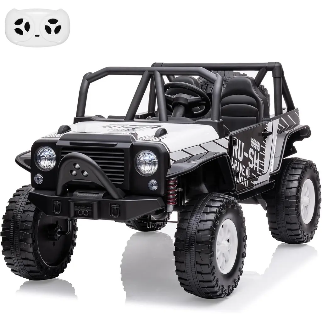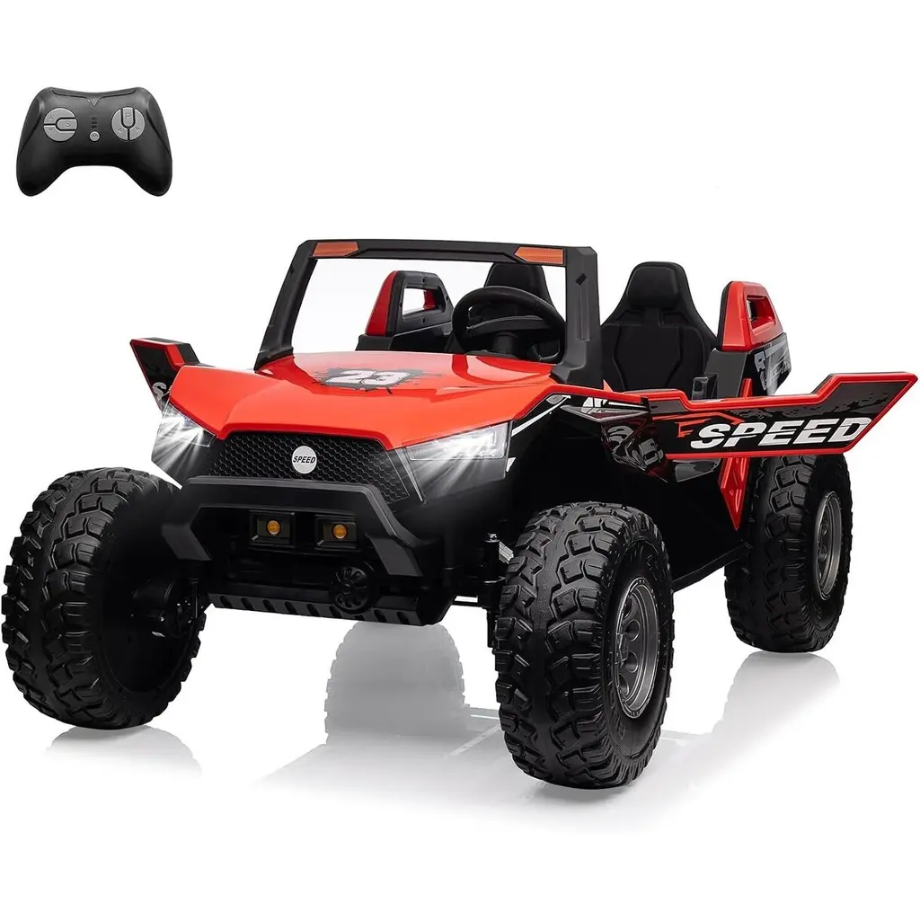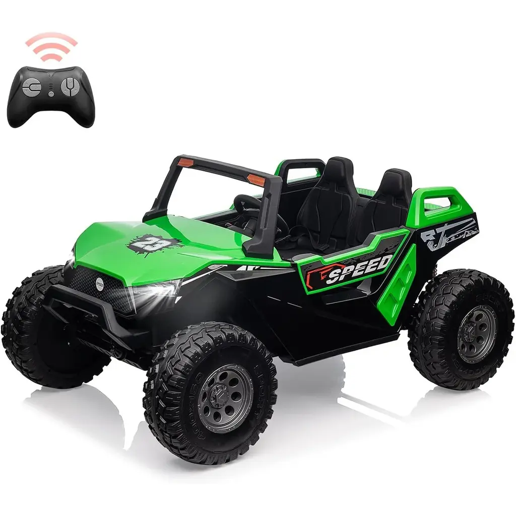 LONG RANGE&4WD:This 24 volt Electric Ride On toy is powered by 24V 7Ah rechargeable battery, matching with 4 powerful motors,6 EVA wheels, enables you to drive 1.2-3.7mph on varied terrain such as grassland, Asphalt, Brick, Cobbled road for around 2 hours. Battery level display and low battery Voice Prompt to keep the battery level under control. TWO DRIVING MODES:Your kid can operate the pedals and steering to steer the car to drive. With only a single click, the power wheels can be turned on or off and offers high and low speeds. The steering can be moved left, right, forward, and backward with the supplied 2.4G remote control. It has 3 adjustable speeds. Naturally, parents only need to click to engage the brakes. SAFETY IS PRIORITY:The Ride on truck Car with parental remote control is equipped with various safety features, While kids driving, parent can always stop the moving car, change the speed or steering direction to avoid impacts. Parent control always takes over kid's manual control to ensure kids safety. The safety belt, lockable door, and soft start design help prevent children from being startled by sudden acceleration. The non-inflatable EVA wheels provide exceptionally smooth rides. REALISTIC DRIVING EXPERIENCE:Kids can control scoot electric motorized car acceleration, deceleration, and braking with the realistic non-slip foot pedal. The steering wheel is kid-friendly with rounded edges, a comfortable grip, and interactive horn and engine sound buttons. Enhancing the realistic experience are the windshield and rearview mirror. DRIVING WITH MUSIC: The kids battery powered vehicles allows you to connect your phone bluetooth or via USB to play music or stories for your little ones. With built-in music and Colorful multi-function control console, the battery car for kids will captivate any toddler's senses.