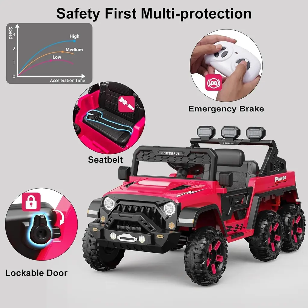 LONG RANGE&4WD:This 24 volt Electric Ride On toy is powered by 24V 7Ah rechargeable battery, matching with 4 powerful motors,6 EVA wheels, enables you to drive 1.2-3.7mph on varied terrain such as grassland, Asphalt, Brick, Cobbled road for around 2 hours. Battery level display and low battery Voice Prompt to keep the battery level under control. TWO DRIVING MODES:Your kid can operate the pedals and steering to steer the car to drive. With only a single click, the power wheels can be turned on or off and offers high and low speeds. The steering can be moved left, right, forward, and backward with the supplied 2.4G remote control. It has 3 adjustable speeds. Naturally, parents only need to click to engage the brakes. SAFETY IS PRIORITY:The Ride on truck Car with parental remote control is equipped with various safety features, While kids driving, parent can always stop the moving car, change the speed or steering direction to avoid impacts. Parent control always takes over kid's manual control to ensure kids safety. The safety belt, lockable door, and soft start design help prevent children from being startled by sudden acceleration. The non-inflatable EVA wheels provide exceptionally smooth rides. REALISTIC DRIVING EXPERIENCE:Kids can control scoot electric motorized car acceleration, deceleration, and braking with the realistic non-slip foot pedal. The steering wheel is kid-friendly with rounded edges, a comfortable grip, and interactive horn and engine sound buttons. Enhancing the realistic experience are the windshield and rearview mirror. DRIVING WITH MUSIC: The kids battery powered vehicles allows you to connect your phone bluetooth or via USB to play music or stories for your little ones. With built-in music and Colorful multi-function control console, the battery car for kids will captivate any toddler's senses.
