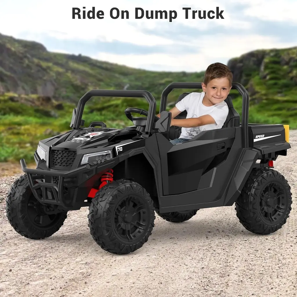 High-Capacity Electric Dump Bed & Shovel - Hetoy electric kids ride on dump truck comes with an electric auto lift dump bed and extra shovel for added interactive play. Your child can use this dump truck to load and unload items, enhancing imagination and creativity. 24V Battery Powered w/4WD 4 Wheels Ride Truck - This dump truck is powered by a 24V rechargeable battery, and driven by 4pcs 200W motors. Max speed is up to 5mph. 20 Inch wide 2-seater is for 2 little kids or 1 to play together. 2 Seaters Truck w/ Electric Dump Bed - Hetoy ride on truck equipped with 2 seaters and came with the a safety belt that can protect kids during driving. Tipping bucket trunk design, can let the children experience the real joy of loading and unloading. Kids Driving & Parental Remote - This 24V ride on truck UTV can be easily started with one button. Kids can drive the truck freely with the foot pedal and steering wheel. The included remote control gives parents full control of the ride-on truck to ensure a safe and enjoyable ride experience for younger children. Perfect Birthday Gift for Kids- Hetoy 24V ride-on toy car with bright LED lights, USB/Bluetooth/music player interface. Whether it's a birthday, Halloween, Christmas, holiday or a special celebratory moment, Our kids electric battery powered car will be the perfect gift for your child!