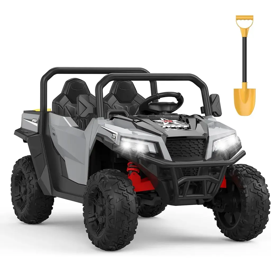 High-Capacity Electric Dump Bed & Shovel - Hetoy electric kids ride on dump truck comes with an electric auto lift dump bed and extra shovel for added interactive play. Your child can use this dump truck to load and unload items, enhancing imagination and creativity. 24V Battery Powered w/4WD 4 Wheels Ride Truck - This dump truck is powered by a 24V rechargeable battery, and driven by 4pcs 200W motors. Max speed is up to 5mph. 20 Inch wide 2-seater is for 2 little kids or 1 to play together. 2 Seaters Truck w/ Electric Dump Bed - Hetoy ride on truck equipped with 2 seaters and came with the a safety belt that can protect kids during driving. Tipping bucket trunk design, can let the children experience the real joy of loading and unloading. Kids Driving & Parental Remote - This 24V ride on truck UTV can be easily started with one button. Kids can drive the truck freely with the foot pedal and steering wheel. The included remote control gives parents full control of the ride-on truck to ensure a safe and enjoyable ride experience for younger children. Perfect Birthday Gift for Kids- Hetoy 24V ride-on toy car with bright LED lights, USB/Bluetooth/music player interface. Whether it's a birthday, Halloween, Christmas, holiday or a special celebratory moment, Our kids electric battery powered car will be the perfect gift for your child!