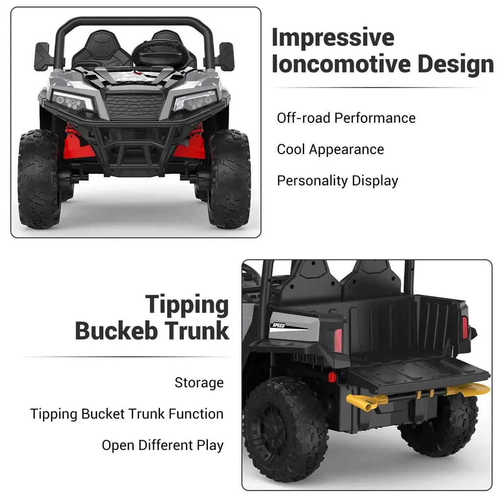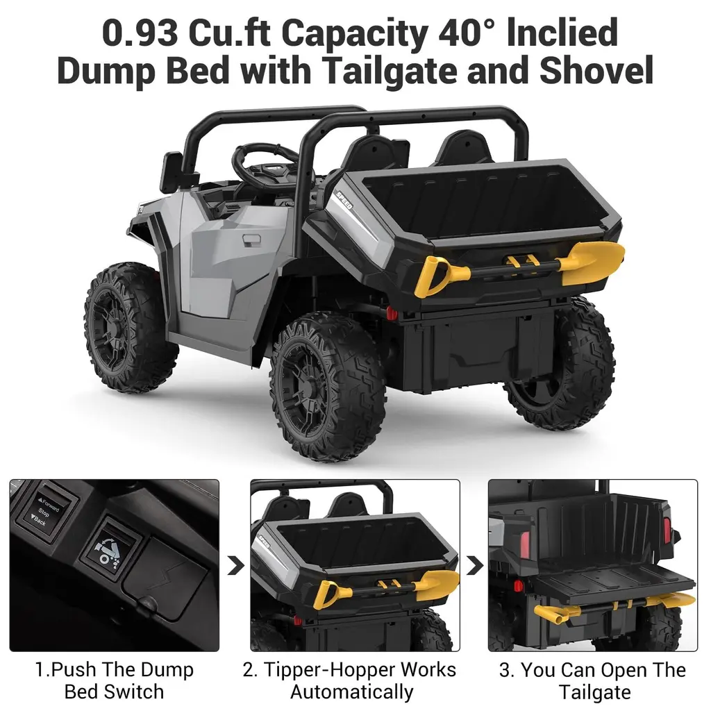 High-Capacity Electric Dump Bed & Shovel - Hetoy electric kids ride on dump truck comes with an electric auto lift dump bed and extra shovel for added interactive play. Your child can use this dump truck to load and unload items, enhancing imagination and creativity. 24V Battery Powered w/4WD 4 Wheels Ride Truck - This dump truck is powered by a 24V rechargeable battery, and driven by 4pcs 200W motors. Max speed is up to 5mph. 20 Inch wide 2-seater is for 2 little kids or 1 to play together. 2 Seaters Truck w/ Electric Dump Bed - Hetoy ride on truck equipped with 2 seaters and came with the a safety belt that can protect kids during driving. Tipping bucket trunk design, can let the children experience the real joy of loading and unloading. Kids Driving & Parental Remote - This 24V ride on truck UTV can be easily started with one button. Kids can drive the truck freely with the foot pedal and steering wheel. The included remote control gives parents full control of the ride-on truck to ensure a safe and enjoyable ride experience for younger children. Perfect Birthday Gift for Kids- Hetoy 24V ride-on toy car with bright LED lights, USB/Bluetooth/music player interface. Whether it's a birthday, Halloween, Christmas, holiday or a special celebratory moment, Our kids electric battery powered car will be the perfect gift for your child!