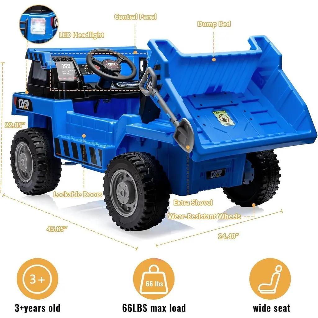 【Kids Electric Car】Driven by two 12V 35W powerful electric motors and four 11 in larger wear-resistance wheels, this kids' ride-on toy can load up to 66lbs, besides flat asphalt roads, it's also very suitable for driving on grassland or gravel road. 12V ride on dump truck keeps kids entertained for hours with realistic sounds, music playback, remote control operation and functioning electric dump bed. 【Automatic Lifting&Dumping】Authentic construction vehicle design features Electric working dump bed, shovel, and battery level indicator to spark imaginative play. 【Kids Driving & Parental Remote】In manual mode, kids can lead themselves at 2 speeds to anywhere they want; In remote control mode, parents can adjust 3 different speeds and flexibly control the direction of this ride-on truck through the remote control, at the same time increase the interaction between parents and kids. 【Multimedia Design】Onboard MP3 player and speakers play tunes or truck sounds while a USB charger keeps devices powered for entertainment on the go. 【Riding Safety】Featured with the key start, horn sound, headlights, dump bed and built-in music, this electric car provides a lifelike driving experience for kids; Low 12V power keeps rides smooth and safe on paved surfaces, while all-terrain tires and protective cage help little builders explore both indoors and out.