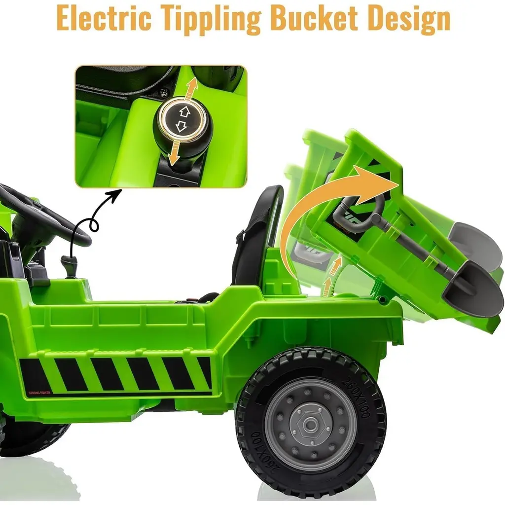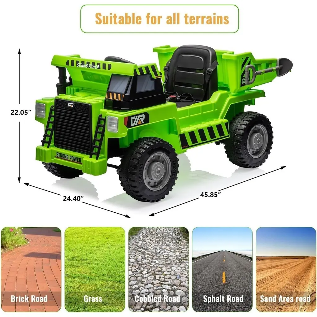 【Kids Electric Car】Driven by two 12V 35W powerful electric motors and four 11 in larger wear-resistance wheels, this kids' ride-on toy can load up to 66lbs, besides flat asphalt roads, it's also very suitable for driving on grassland or gravel road. 12V ride on dump truck keeps kids entertained for hours with realistic sounds, music playback, remote control operation and functioning electric dump bed. 【Automatic Lifting&Dumping】Authentic construction vehicle design features Electric working dump bed, shovel, and battery level indicator to spark imaginative play. 【Kids Driving & Parental Remote】In manual mode, kids can lead themselves at 2 speeds to anywhere they want; In remote control mode, parents can adjust 3 different speeds and flexibly control the direction of this ride-on truck through the remote control, at the same time increase the interaction between parents and kids. 【Multimedia Design】Onboard MP3 player and speakers play tunes or truck sounds while a USB charger keeps devices powered for entertainment on the go. 【Riding Safety】Featured with the key start, horn sound, headlights, dump bed and built-in music, this electric car provides a lifelike driving experience for kids; Low 12V power keeps rides smooth and safe on paved surfaces, while all-terrain tires and protective cage help little builders explore both indoors and out.