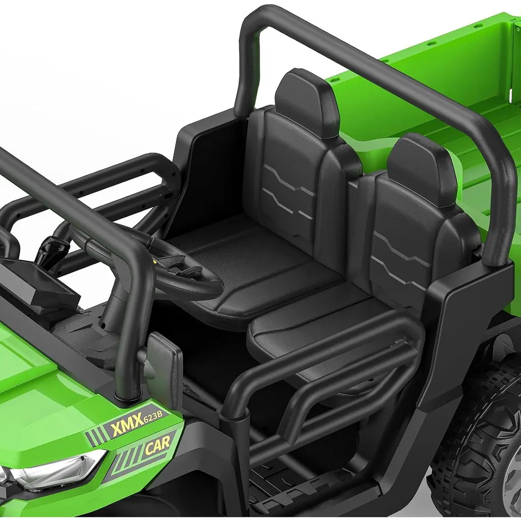 2 Seaters Truck with Electric Dump Bed - Our ride on truck equipped with 2 seaters and came with the a safety belt that can protect kids during driving. Tipping bucket trunk design, can let the children experience the real joy of loading and unloading. Driving Modes and Remote Control Mode - The dump truck has two driving modes designed to be suitable for kid of different ages, let your kid can play from 4 to 8 years old. 4 to 5 years old can use the remote control mode, enjoy the time of parents and children together. 5 to 8 years old can use the driving mode, so that kid can experience the fun of driving Multi-Function Control Console - Easy to start by one key. This electric dump truck features music, horn, headlights, high/low speed function and phone connections, which enables the kids can enjoy the rear driving experience with this car. 24V 4WD 6 Wheels Ride On Car - This dump truck is powered by a 24V rechargeable battery, and driven by 4pcs 75W motors. Max speed is up to 5mph. 20 Inch wide 2-seater is for 2 little kids or 1 to play together. Best Gift for kids - Our kids ride-on dump truck is made of safe material and equipped with multiple functions that can enrich your little one's life and enhance parent-child relationship. Certificated with ASTM and CPSIA, it can be a surprising Christmas gift or birthday gift for your children or grandchildren.