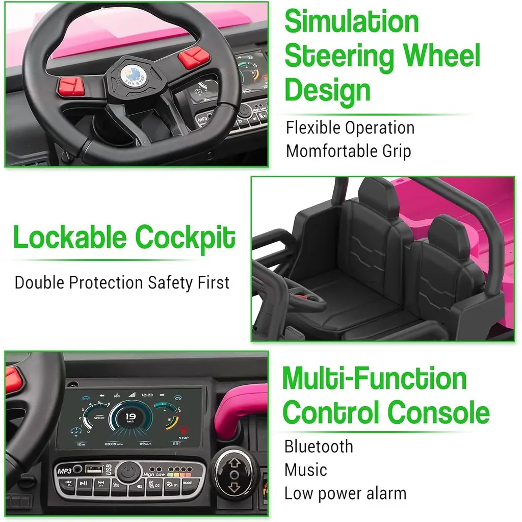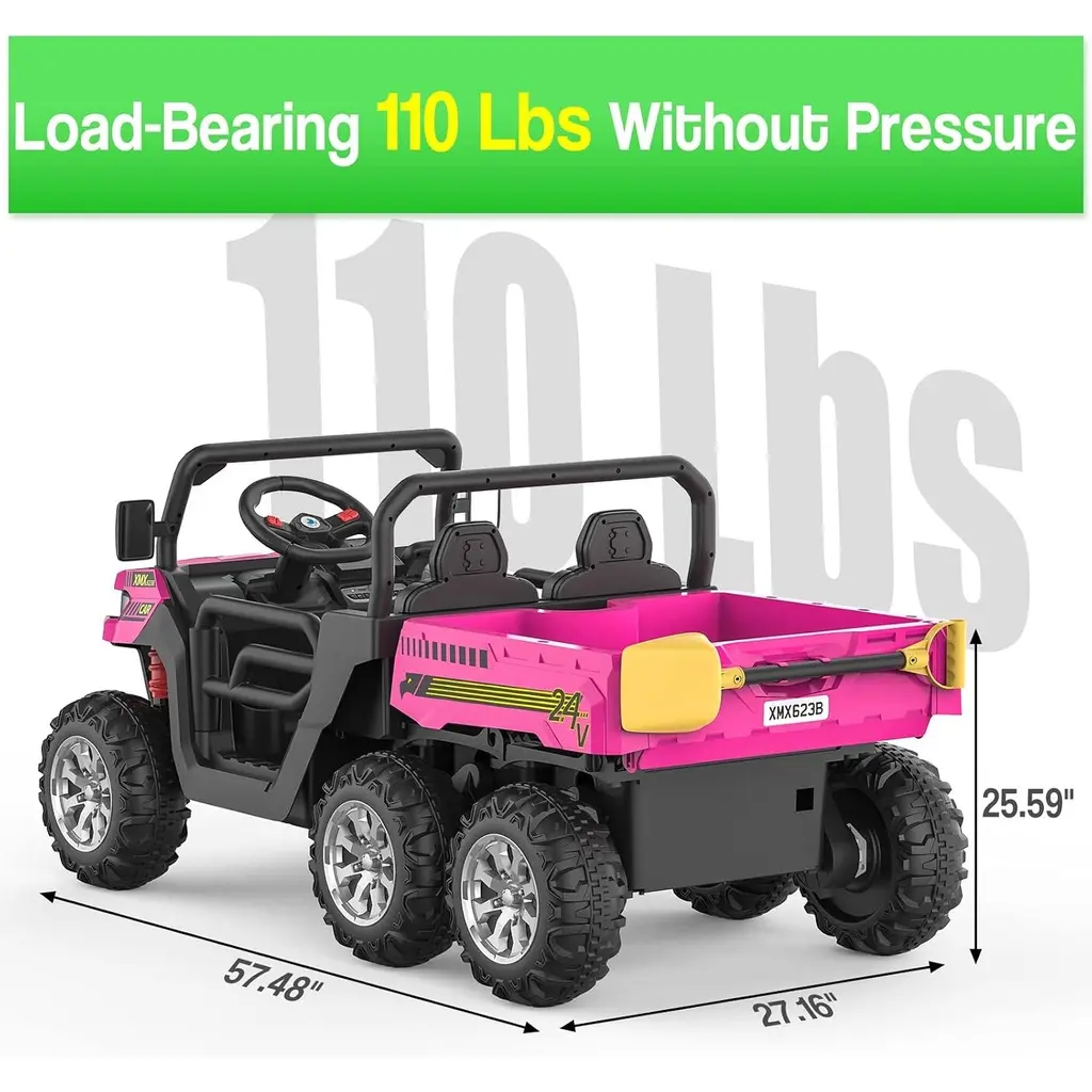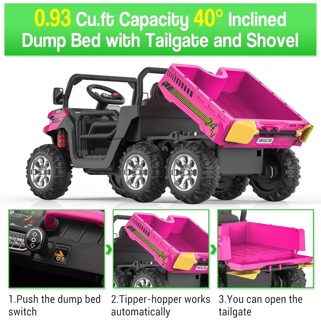 2 Seaters Truck with Electric Dump Bed - Our ride on truck equipped with 2 seaters and came with the a safety belt that can protect kids during driving. Tipping bucket trunk design, can let the children experience the real joy of loading and unloading. Driving Modes and Remote Control Mode - The dump truck has two driving modes designed to be suitable for kid of different ages, let your kid can play from 4 to 8 years old. 4 to 5 years old can use the remote control mode, enjoy the time of parents and children together. 5 to 8 years old can use the driving mode, so that kid can experience the fun of driving Multi-Function Control Console - Easy to start by one key. This electric dump truck features music, horn, headlights, high/low speed function and phone connections, which enables the kids can enjoy the rear driving experience with this car. 24V 4WD 6 Wheels Ride On Car - This dump truck is powered by a 24V rechargeable battery, and driven by 4pcs 75W motors. Max speed is up to 5mph. 20 Inch wide 2-seater is for 2 little kids or 1 to play together. Best Gift for kids - Our kids ride-on dump truck is made of safe material and equipped with multiple functions that can enrich your little one's life and enhance parent-child relationship. Certificated with ASTM and CPSIA, it can be a surprising Christmas gift or birthday gift for your children or grandchildren.