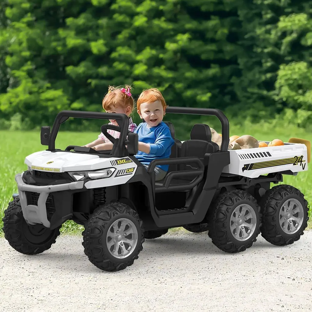2 Seaters Truck w/ Electric Dump Bed: This ride on truck equipped with 2 seaters and came with the a safety belt that can protect kids during driving. Tipping bucket trunk design, can let the children experience the real joy of loading and unloading. Driving Modes and Remote Control Mode: The dump truck has two driving modes designed to be suitable for kid of different ages, let your kid can play from 1 to 8 years old. 1 to 3 years old can use the remote control mode, enjoy the time of parents and children together. 3 to 8 years old can use the driving mode, so that kid can experience the fun of driving. Multi-Function Control Console: Easy to start by one key. This electric dump truck features music, horn, headlights, high/low speed function and phone connections, which enables the kids can enjoy the rear driving experience with this car. 24V 4WD 6 Wheels Ride Truck: This dump truck is powered by a 24V rechargeable battery, and driven by 4pcs 75W motors. Max speed is up to 5mph. 20 Inch wide 2-seater is for 2 little kids or 1 to play together. Best Gift for kids: Our kids ride-on dump truck is made of safe material and equipped with multiple functions that can enrich your little one's life and enhance parent-child relationship. Certificated with ASTM and CPSIA, it can be a surprising Christmas gift or birthday gift for your children or grandchildren.