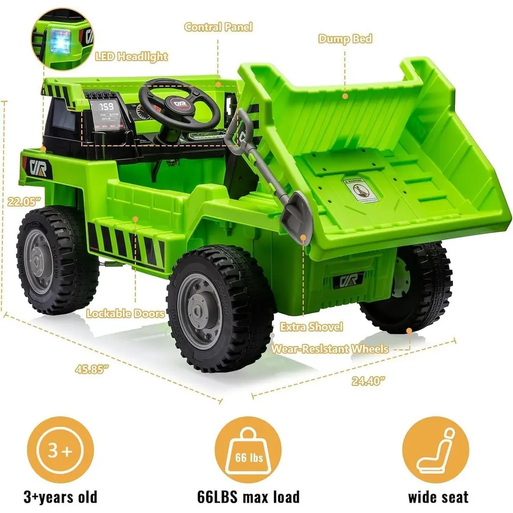【Kids Electric Car】Driven by two 12V 35W powerful electric motors and four 11 in larger wear-resistance wheels, this kids' ride-on toy can load up to 66lbs, besides flat asphalt roads, it's also very suitable for driving on grassland or gravel road. 12V ride on dump truck keeps kids entertained for hours with realistic sounds, music playback, remote control operation and functioning electric dump bed. 【Automatic Lifting&Dumping】Authentic construction vehicle design features Electric working dump bed, shovel, and battery level indicator to spark imaginative play. 【Kids Driving & Parental Remote】In manual mode, kids can lead themselves at 2 speeds to anywhere they want; In remote control mode, parents can adjust 3 different speeds and flexibly control the direction of this ride-on truck through the remote control, at the same time increase the interaction between parents and kids. 【Multimedia Design】Onboard MP3 player and speakers play tunes or truck sounds while a USB charger keeps devices powered for entertainment on the go. 【Riding Safety】Featured with the key start, horn sound, headlights, dump bed and built-in music, this electric car provides a lifelike driving experience for kids; Low 12V power keeps rides smooth and safe on paved surfaces, while all-terrain tires and protective cage help little builders explore both indoors and out.