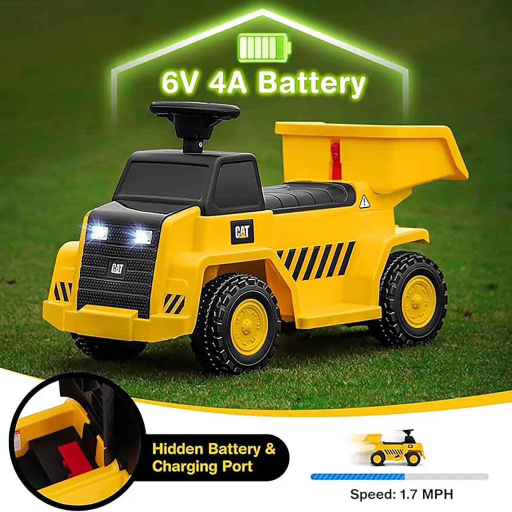Build a world of driving fun for kids with our licensed Caterpillar ride on dump truck! Offering kids a truly immersive driving experience, this electric ride on dump truck boasts an authentic steering wheel, buttons, and foot pedal. The addition of a horn sound and LED lights elevates the excitement during playtime. The dump bed, easily adjustable and detachable, offers ample storage space for children's belongings. With 4 threaded wheels, this battery operated construction vehicle ensures a smooth ride on various surfaces. The spacious seat, cozy footrests, and an anti-rollover device are designed to provide a secure and enjoyable experience for young drivers. This CAT construction vehicle is not only a reliable gift for toddlers aged 18-36 months but also promises developmental benefits alongside endless entertainment. Features:Specification