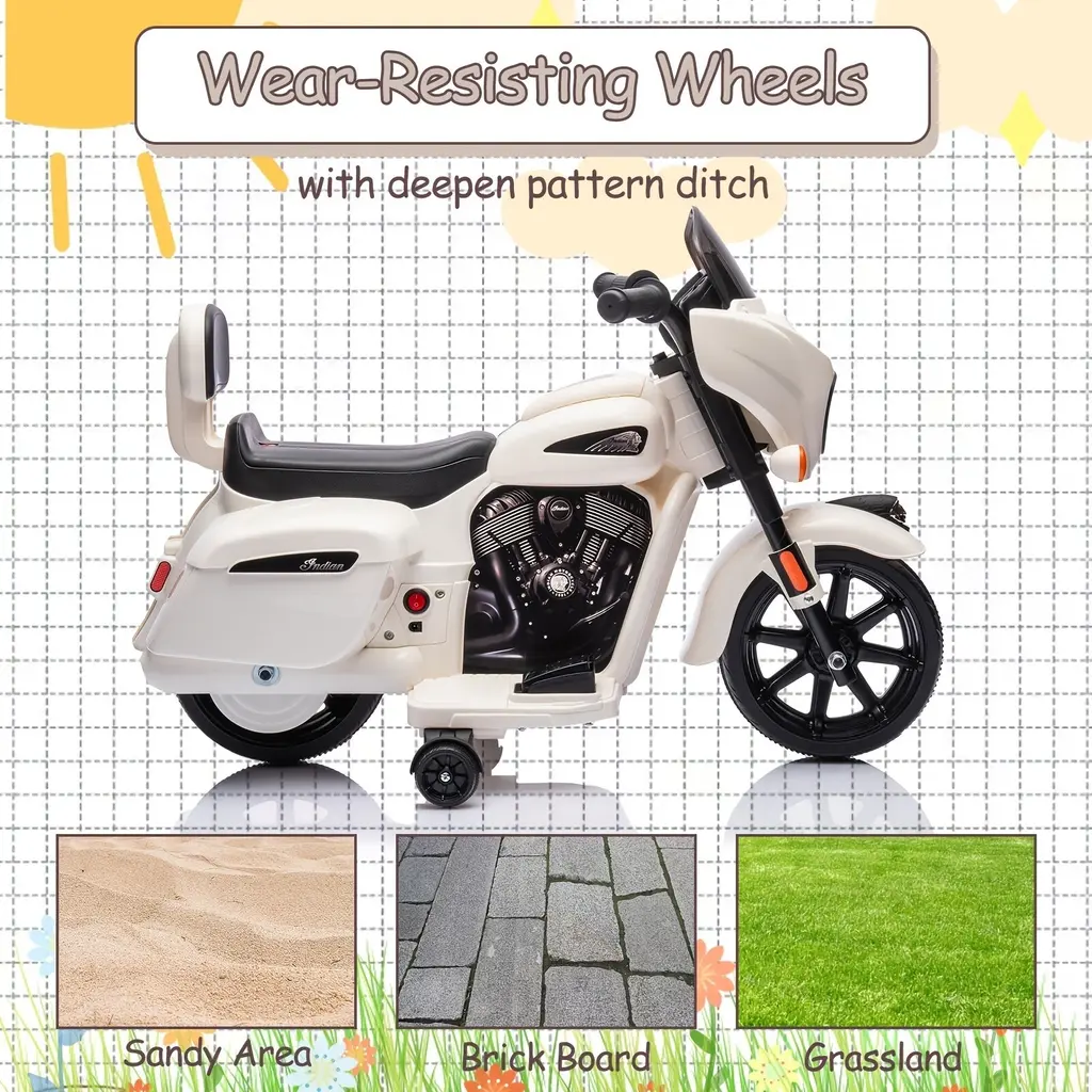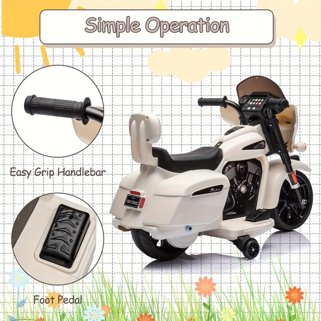 Licensed Motorcycle: This ride-on motorcycle features rugged traction wheels designed for stability and safety, even when cruising through puddles. The extra-wide tires provide strength and stability, giving your child a powerful driving experience as they navigate through grass and soft terrain. More power means more fun!Two Safety Training Wheels: Equipped with two training wheels and a reliable suspension system, this motorcycle helps keep your child balanced while they learn to ride. The shock-absorption wheels ensure a smooth and safe ride, giving parents peace of mind.Multi-Media Functionality: With built-in music features, this kids' motorcycle allows little riders to listen to their favorite tunes while on the move, enhancing the excitement and enjoyment of their riding experience.Safety Features: The headlights provide essential illumination for evening playtime or during low-light conditions, increasing visibility and safety. Assembly is a breeze with the detailed manual included in the package, making it easy to get your child on the road in no time!Versatile Riding Terrain: The durable EVA wheels enable your child to ride on various surfaces, including grass, brick paths, wooden floors, asphalt, and plastic runways, so the adventure never has to stop!
