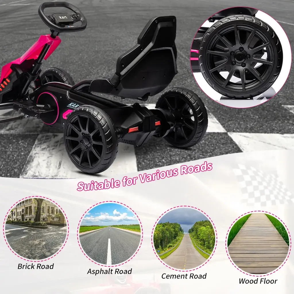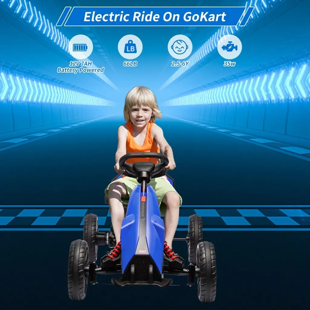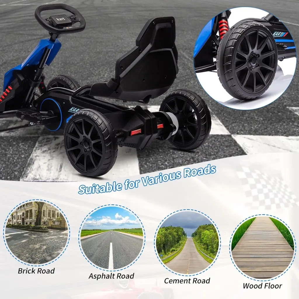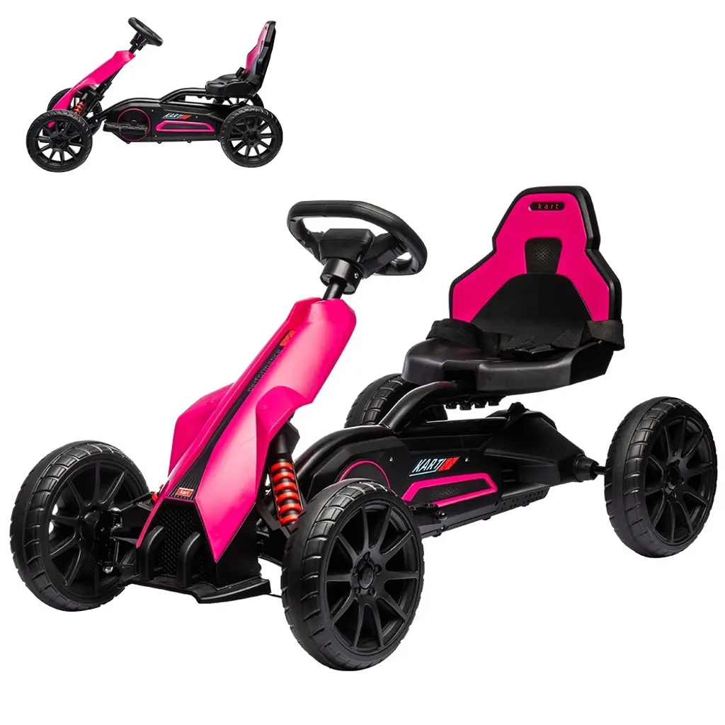 Introduce your little ones to the thrill of racing with our Electric Go Kart for Kids. This pedal go kart is powered by a 12V battery, offering a fun and exciting outdoor ride-on experience for toddlers.Fun and Excitement: Our Electric Go Kart for Kids brings the thrill of racing to your little ones. With its 12V battery-powered design, toddlers can enjoy an exciting outdoor ride-on experience.Easy and Safe Operation: This pedal go kart is designed with safety in mind. With a low-speed setting and intuitive pedal-powered operation, it ensures a controlled and secure ride for young children.Outdoor Adventure: Let your kids embark on outdoor fun with this ride-on toy vehicle. Whether it's in the backyard or at the park, this go kart provides hours of entertainment and promotes active play.Long-lasting Battery Power: Powered by a 12V battery, this go kart offers extended ride time for continuous fun. Simply charge the battery, and watch as your children zoom around with enthusiasm.Perfect Gift Choice: Surprise your boys and girls with this go kart. It's an excellent toy gift that encourages motor skills development, fosters a love for outdoor activities, and guarantees unforgettable moments.