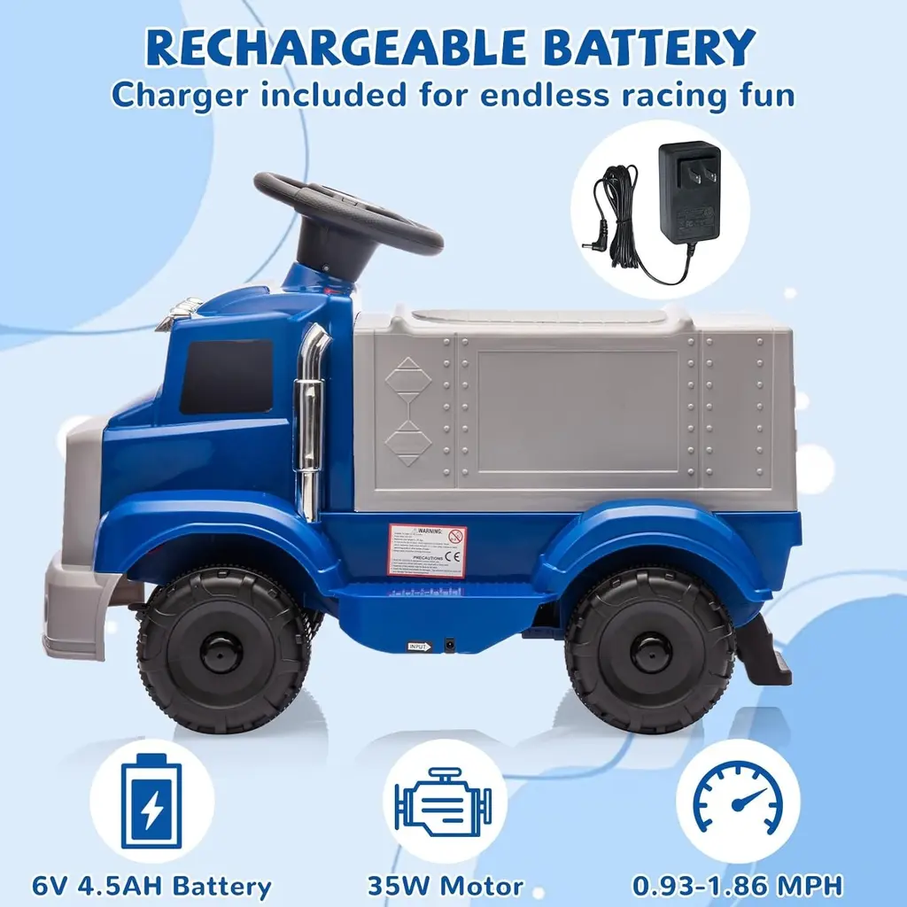 FUN DRIVING EXPERIENCE: This fun kids ride on truck features two bright headlights, five LED lights, and music along with a variety of sounds and music at the press of a button for a fun and safe riding experience BUILT IN HIDDEN STORAGE: This kids cars to drive features a spacious storage area beneath the seat that mimics a truck compartment. Perfect for stashing snacks, toys, books, and crayons, it gives kids their very own little secret hideout SAFE TO DRIVE: This kids ride on toy features an anti-tilt device and rounded corners for added safety. Plus, it is ASTM and CPSIA certified, giving you peace of mind while your little one rides! Dimensions: 26.18"L x 14.56"W x 18.11"H. Weight capacity: 55 lbs. EASY TO USE: Powered by 6V 4.5AH battery and 35W motor, this kids electric car can cruise at a steady speed of 1.86 mph on various terrains. With a simple one-touch start button, flexible steering wheel, and accelerator pedal, your little adventurer can easily take charge and embark on a thrilling journey PERFECT GIFT FOR TODDLERS: The intuitive forward, reverse, and stop buttons make it a breeze for your child to customize their ride, all while enhancing their hand-eye coordination.This 6v ride on toys for toddlers is the perfect gift for holidays, Christmas, Thanksgiving, New Year, and any special occasion
