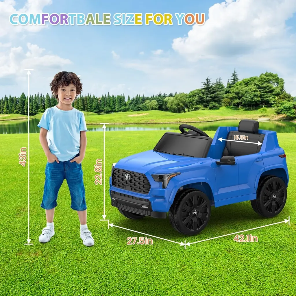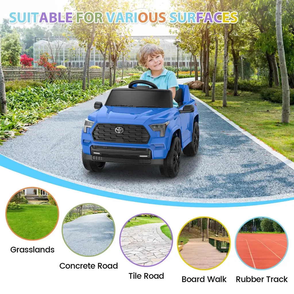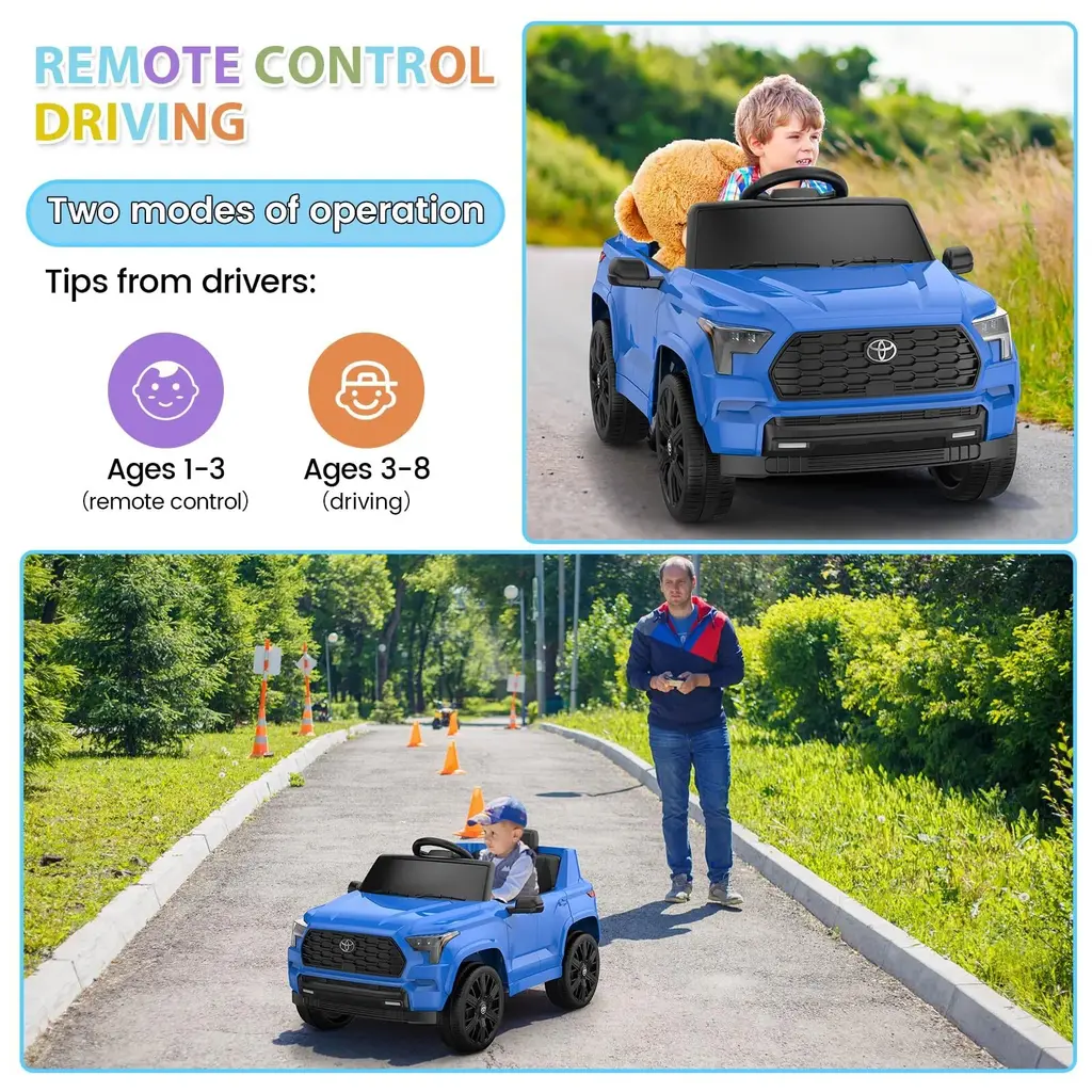 LICENSED TOYOTA RIDE CAR - Officially licensed Toyota ride-on car that allows your child to comfortably cruise in the vehicle and bring a friend or sibling along for the ride. DRIVING MODES AND REMOTE CONTROL MODE - Hetoy ride on truck has two driving modes designed to be suitable for kid of different ages, let your kid can play from 37 to 96 months old. 4 to 5 years old can use the remote control mode. MULTI-FUNCTION CONTROL CONSOLE - Easy to start by one-touch start. This electric truck features BT speaker, horn, headlights and high/low speed function, which enables the kids can enjoy the real driving experience with this car. POWERFUL 12V & REALISTIC DESIGN - Adjustable seatbelt, bright LED headlights, lockable doors, and grid windshield for off-road style, with a 12V motor and traction tires to ride on different terrains. BEST GIFT FOR KIDS - Hetoy kids ride-on truck is made of safe material and equipped with multiple functions that can enrich your little one's life and parent-child relationship.