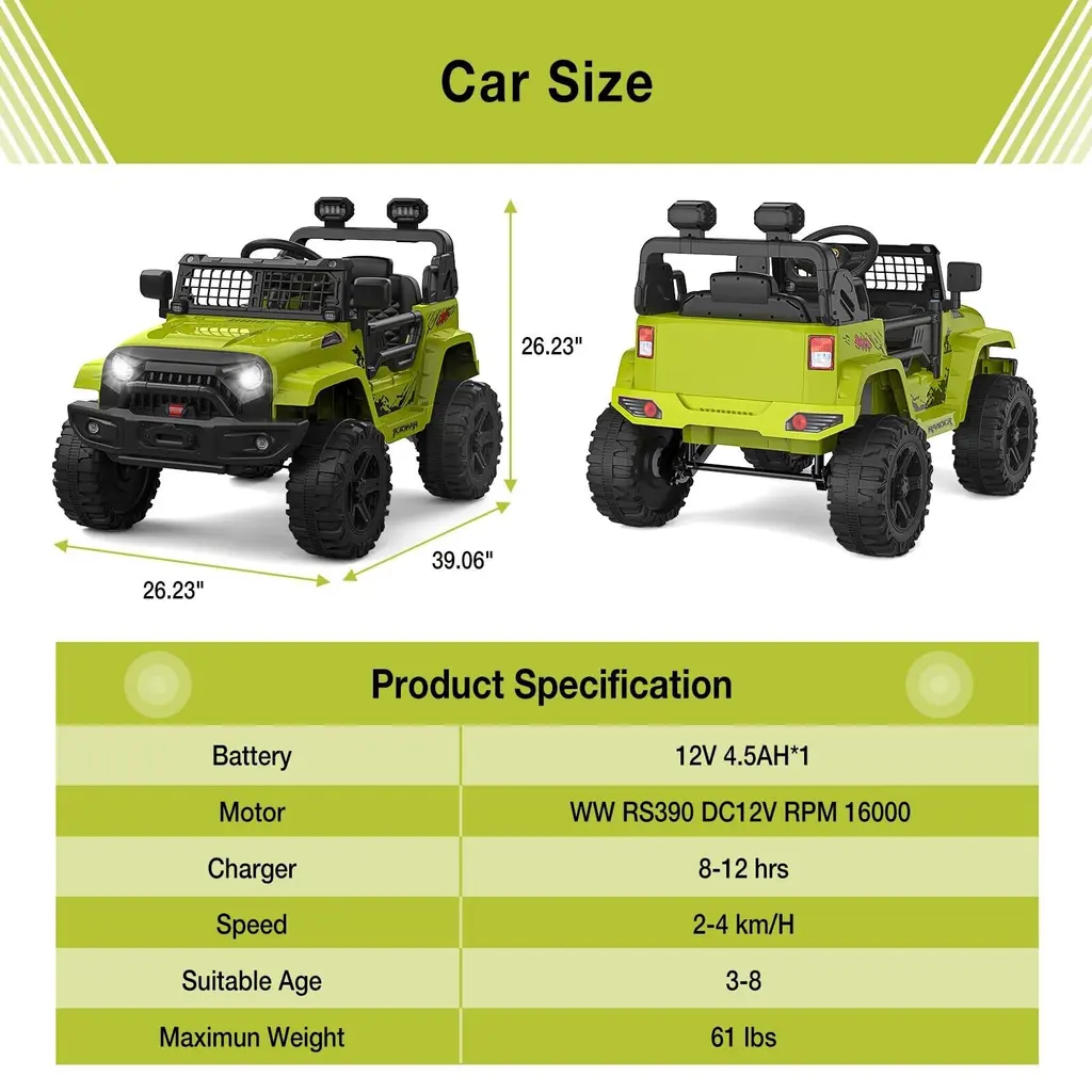 SAFETY TRUCK: Hetoy ride on truck equipped with 1 seat and came with the a safety belt that can protect kids during driving. DRIVING MODES AND REMOTE CONTROL MODE: Hetoy ride on truck has two driving modes designed.4 to 5 years old can use the remote control mode, enjoy the time of parents and children together. 5 to 8 years old can use the driving mode. MULTI-FUNCTION CONTROL CONSOLE: Easy to start by one key. This electric truck features bluetooth speaker, horn, headlights and high/low speed function. POWERFUL 12V & REALISTIC DESIGN: Adjustable seatbelt, bright LED headlights, lockable doors, and grid windshield for off-road style. BEST GIFT FOR KIDS: Hetoy kids ride-on truck is made of safe material and equipped with multiple functions that can enrich your little one's life and enhance parent-child relationship. Specifications Dimensions:39.06 x 26.23 x 26.23 inches Item Weight:41.9lbs