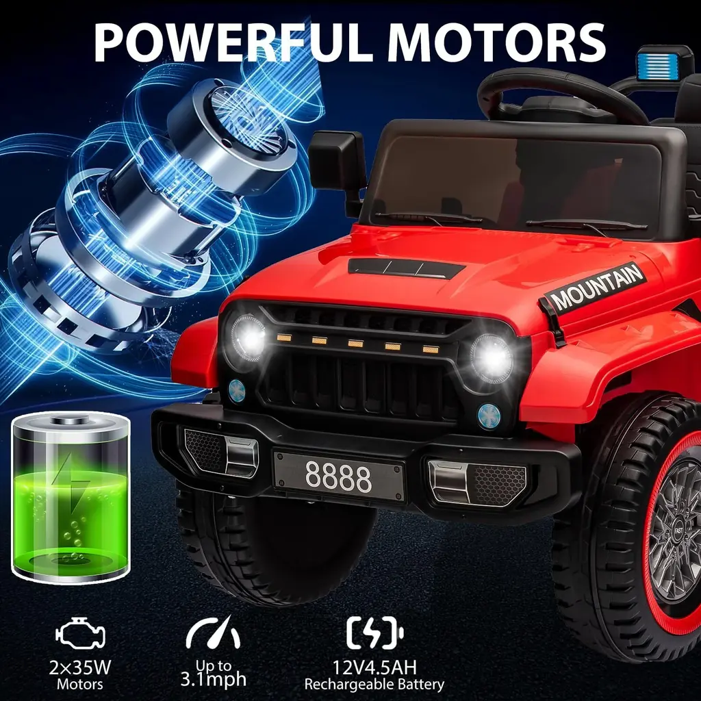 Ride on Car with Remote Control - This electric truck has 2 driving modes suitable for kids of different ages. As for younger kids aged 1-3, parents can use the remote control to operate the electric car, enjoy the time together. For kids aged 3-8, they can operate it by pedal, experience the fun of driving. 12V Battery Powered Ride Truck - This kids electric vehicle is powered by a 12V rechargeable battery, and driven by 2 x 35W motors, make this kids ride on car provide children with an immersive and realistic experience at speeds ranging from 1.25-3.1 mph. Multifunctional Control Console - Easy to start by one start button. This ride on toy truck features music, horn, LED lights, high/low speed function, which makes kids can enjoy the rear driving experience with this car. Safety as First - This ride-on truck comes with the a safety belt that can protect kids during driving. With soft start/brake technology and the emergency brake button, when being in the emergency situation, it is very good to protect the safety of kids. Perfect Gift for Boys Girls - This 12v ride on toy is equipped with multiple functions that can enrich your little one's life and the parent-child relationship. Certificated with ASTM and CPSIA, it can be a surprising gift for your lovely children or grandchildren.