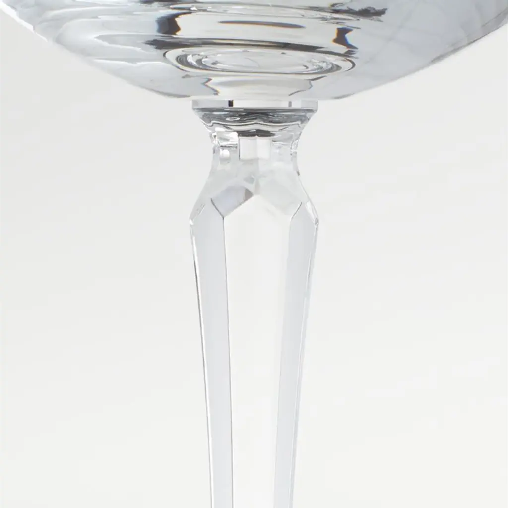 Our Ridgecrest glassware collection sparkles with facets, infusing every sip with a festive, formal air. The beautifully rounded bowl of this coupe perches atop an angular and articulated stem that flows into the base. A Crate and Barrel exclusive, this coupe glass joins the other pieces in our Ridgecrest collection for a coordinated cocktail hour or dinner and cleans up easily in the dishwasher.