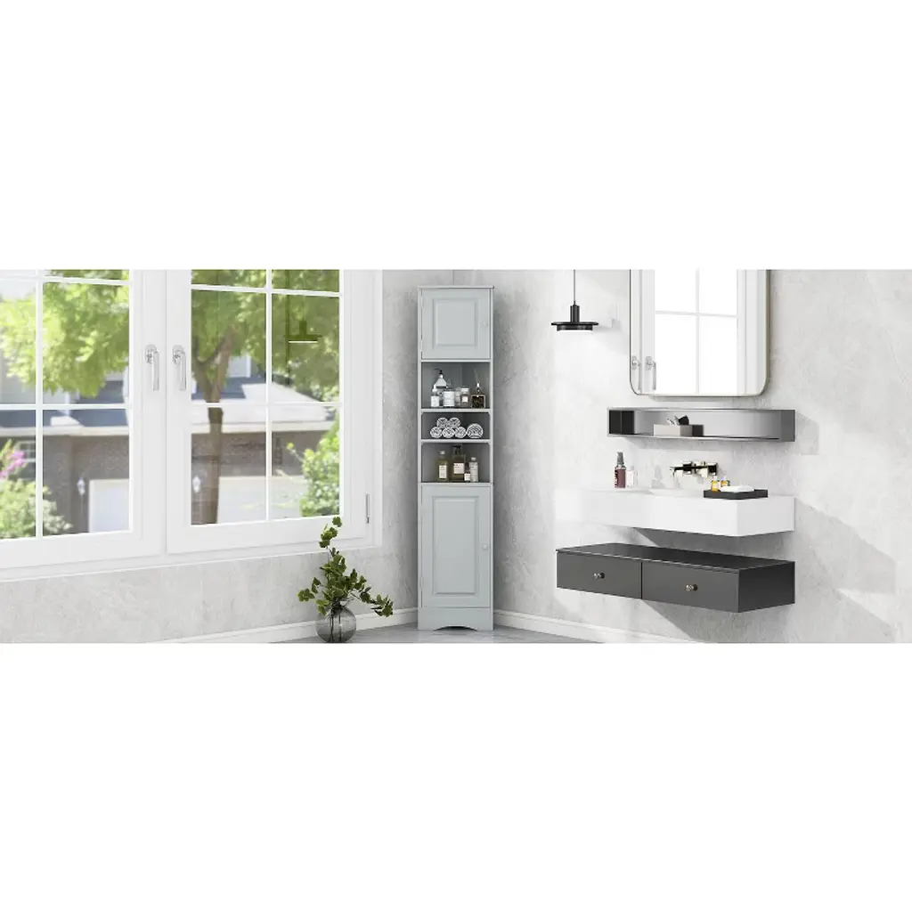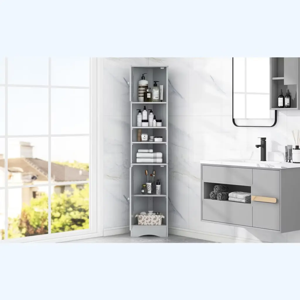 This bathroom storage cabinet is triangular in design, which can be placed in the corner to save space, and this cabinet belongs to the tall cabinet with removable and adjustable dividers inside, which can satisfy your needs of storing different toiletries. Its appearance is fresh and clean, and it is also beautiful to put in the bathroom.