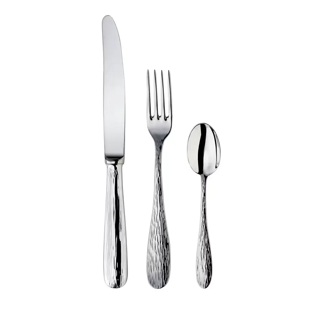 Part of the Riflessi Collection, this 18-piece dessert silverware set is distinguished for its functionality and unconventional look. The set is composed of six pairs of forks, knives, and spoons and features a lustrous silver plating. The timeless silver-plating provides a resistant and anti-corrosion finish that will endure throughout the course of time.