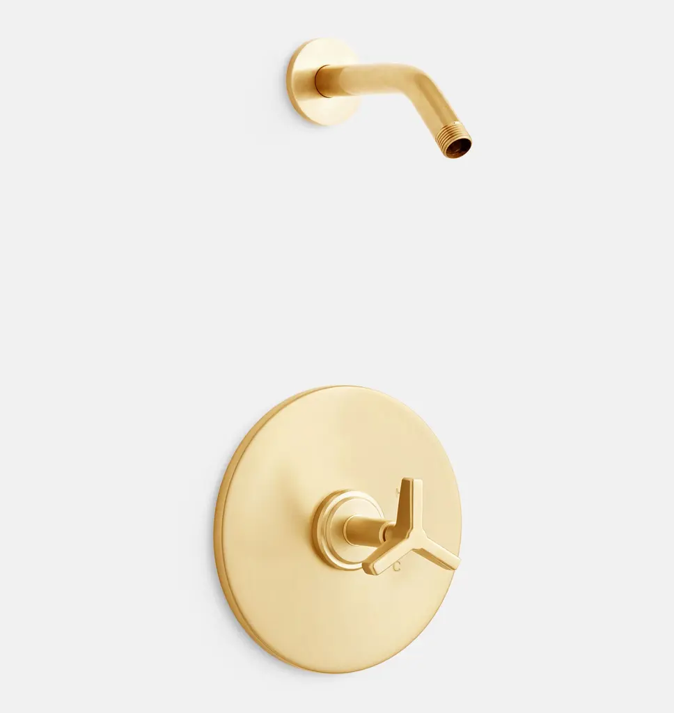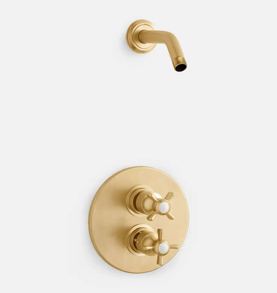 Simple yet textural, Rigdon highlights its elegance through a unique "coining" detail, which emphasizes its form and connections. Our thermostatic shower sets feature dual knobs for easy, separate adjustment of temperature and water pressure—offering a superior water flow, increased energy efficiency, and consistent water temperature. Complete your set with your choice of shower head to create the ideal bath experience.