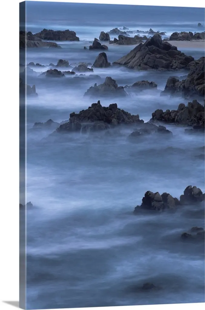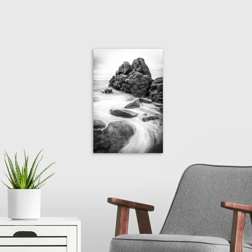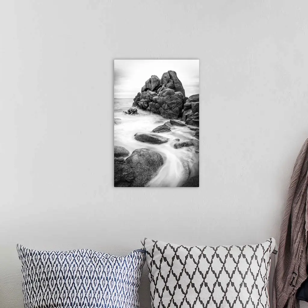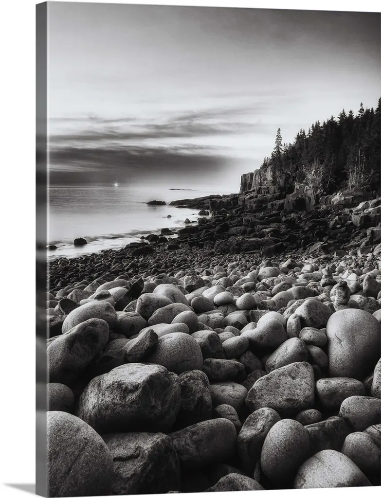 A black and white photograph of a rocky coastline.