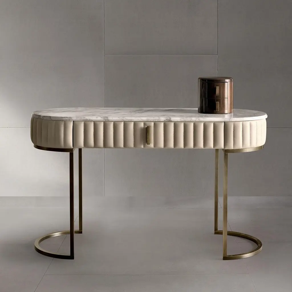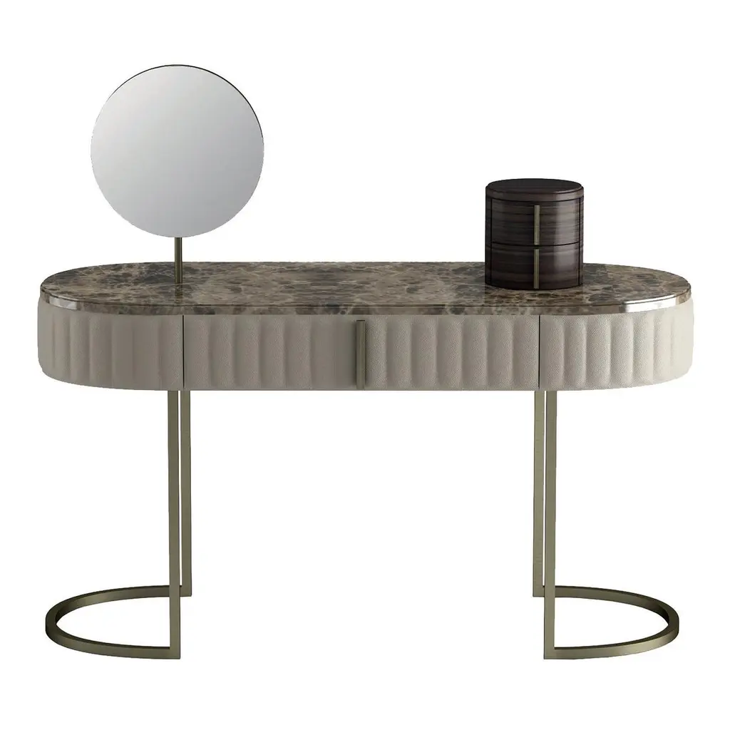 The contemporary style of this original vanity table provides a stylish surface for perfume, makeup, and jewelry. Two burnished brass tubular legs support an elongated oval Emperador marble top with a large rim upholstered in grosgrain design gray leather. Two rectangular brass handles adorn the front sliding drawer, lined in fabric, and a round mirror is mounted on one side of the top. With its mix of monochromatic natural hues, smooth lines, and detailed finishes, this elegant and feminine piece will bring a chic accent to any bedroom. (Mirror and jewelry box on request).