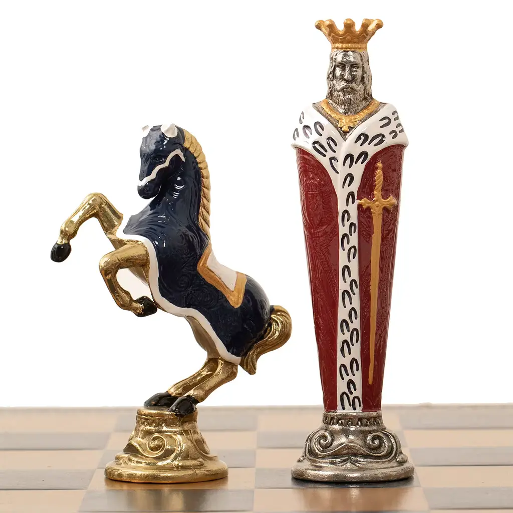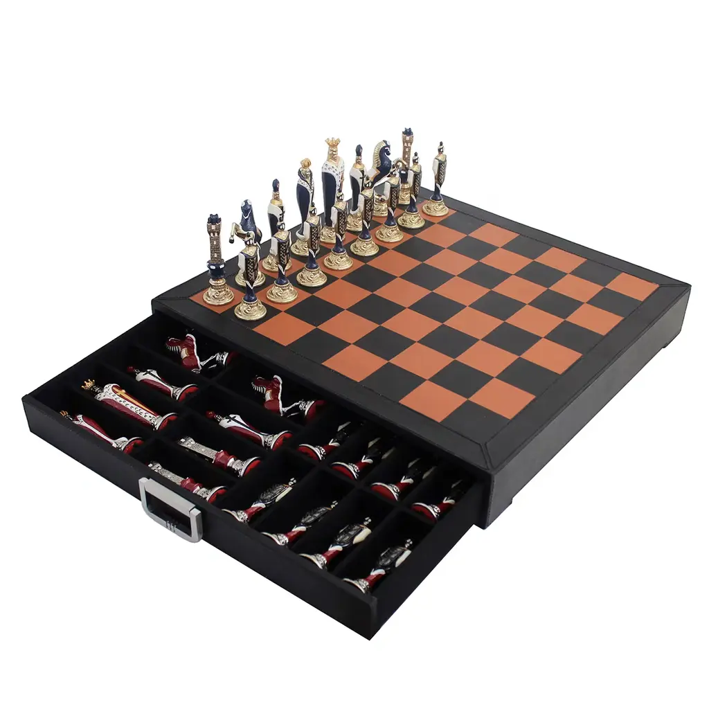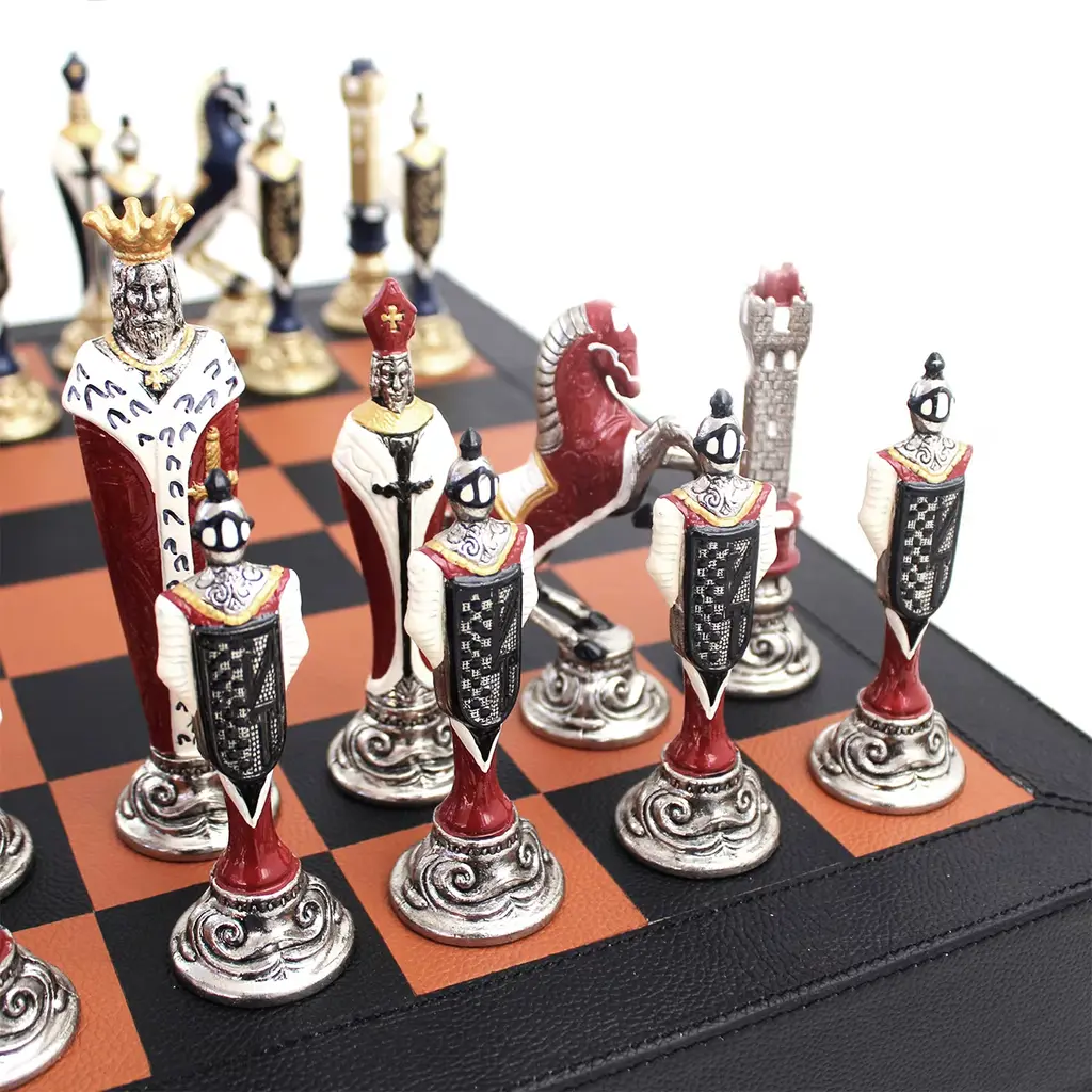 Florentine style is splendidly exemplified by this exclusive chess set where every metal chessman is minutely painted by hand. Masterfully sewn and finished by hand, the two-toned leather chessboard - measuring cm 48x48x6 - unmistakably states the set's precious sartorial flair. Drawers to put away chessmen complete the design. Kings are cm 13.6 high.