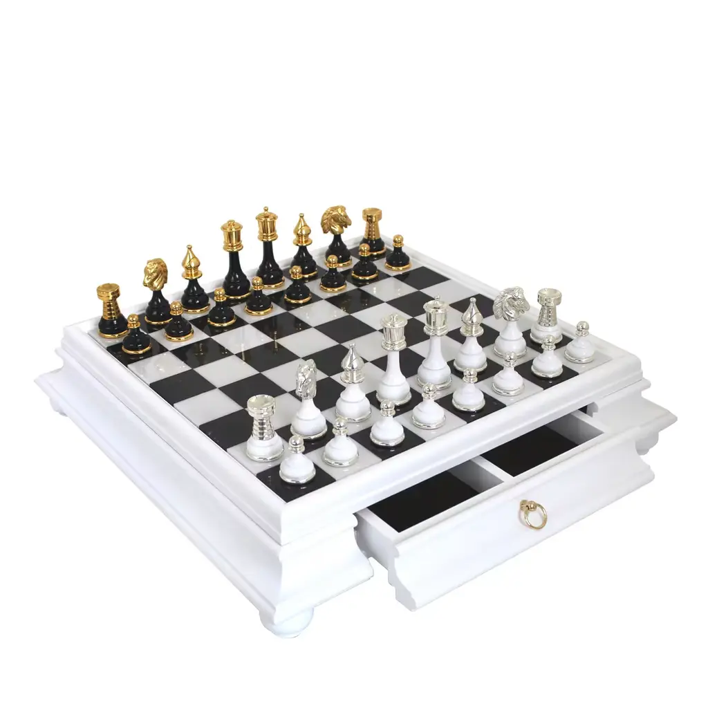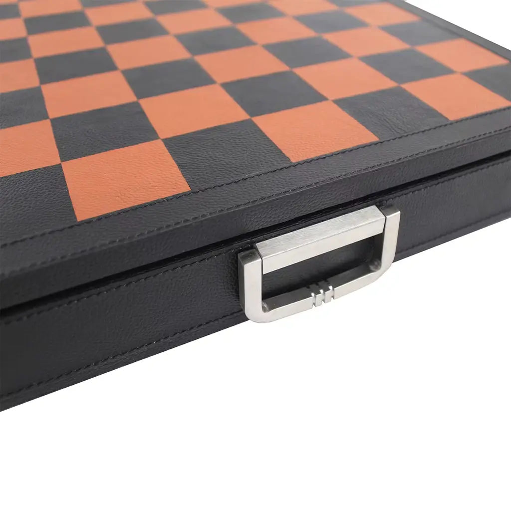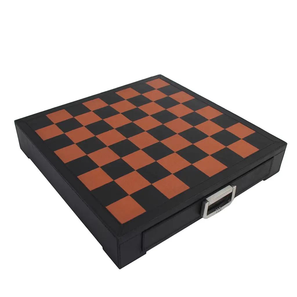 Florentine style is splendidly exemplified by this exclusive chess set where every metal chessman is minutely painted by hand. Masterfully sewn and finished by hand, the two-toned leather chessboard - measuring cm 48x48x6 - unmistakably states the set's precious sartorial flair. Drawers to put away chessmen complete the design. Kings are cm 13.6 high.