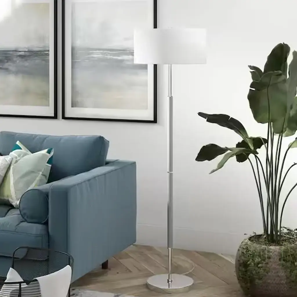RINGSTA / SKAFTET Floor lamp - white/nickel plated. You can create a soft, cozy atmosphere in your home with a textile shade that spreads a diffused and decorative light. Easy to take home since the lampshade comes in a flat-pack.