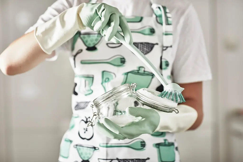 RINNIG Dish brush - green. Sticks to sinks, tiles etc., thanks to the suction cup. The scraper edge makes it easier to remove stubborn food.