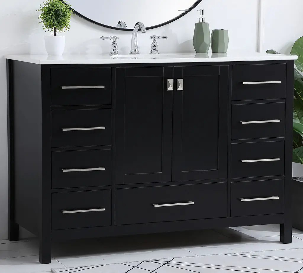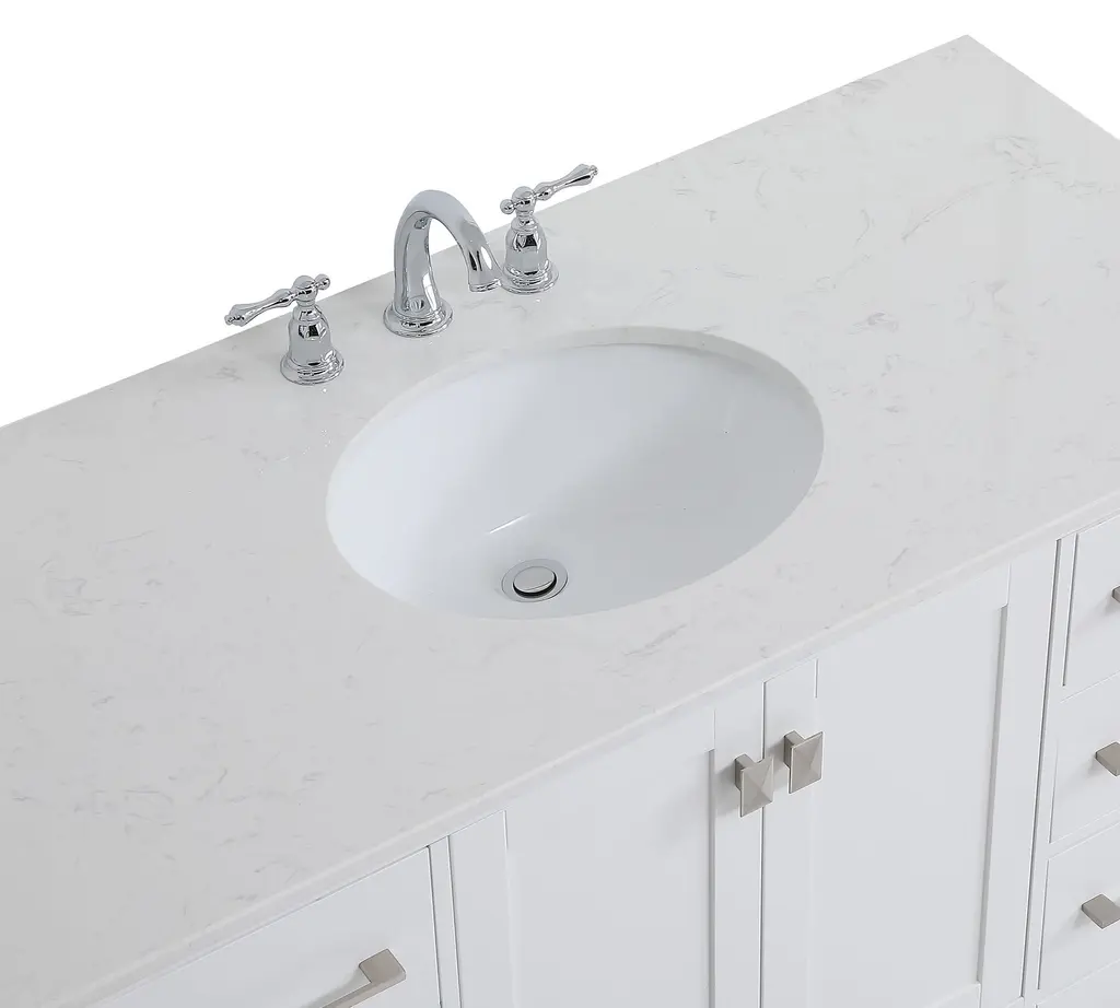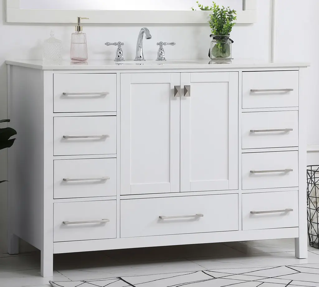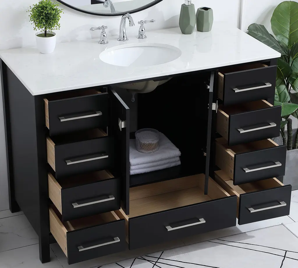 Elegant and classic, this vanity adds spa-worthy luxury to your bath. Topped with engineered marble and finished with refined hardware, it features nine drawers to stylishly store all your bath supplies.