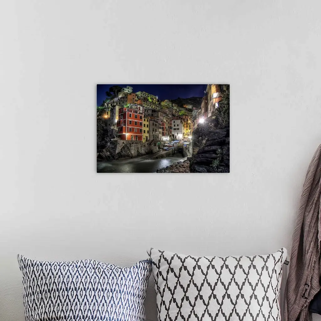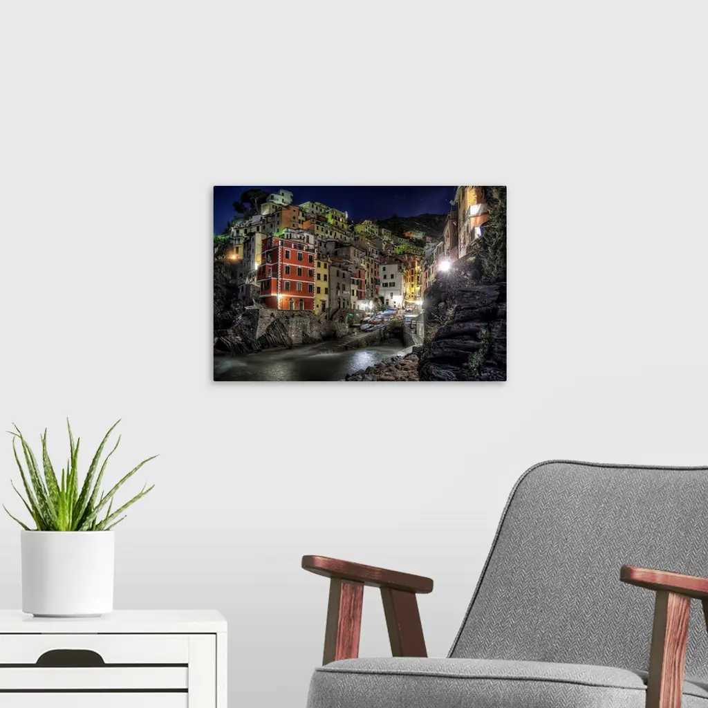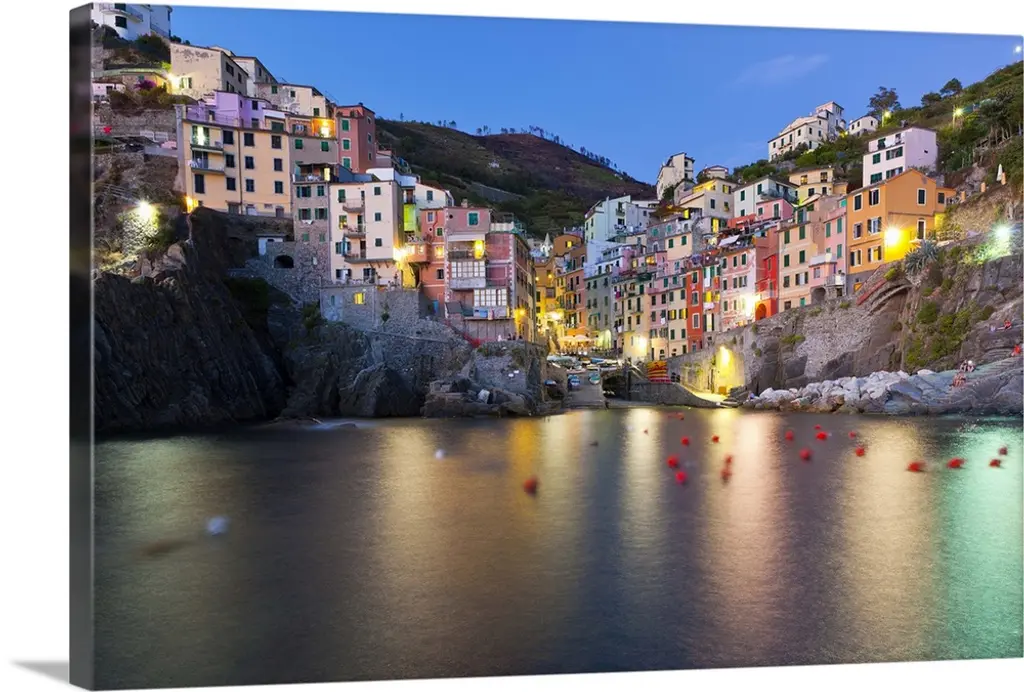 Riomaggiore at the edge of the ocean, in the evening, Italy.