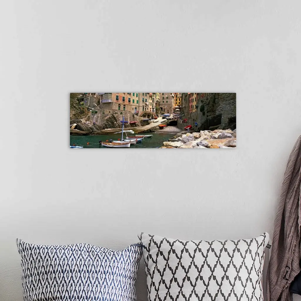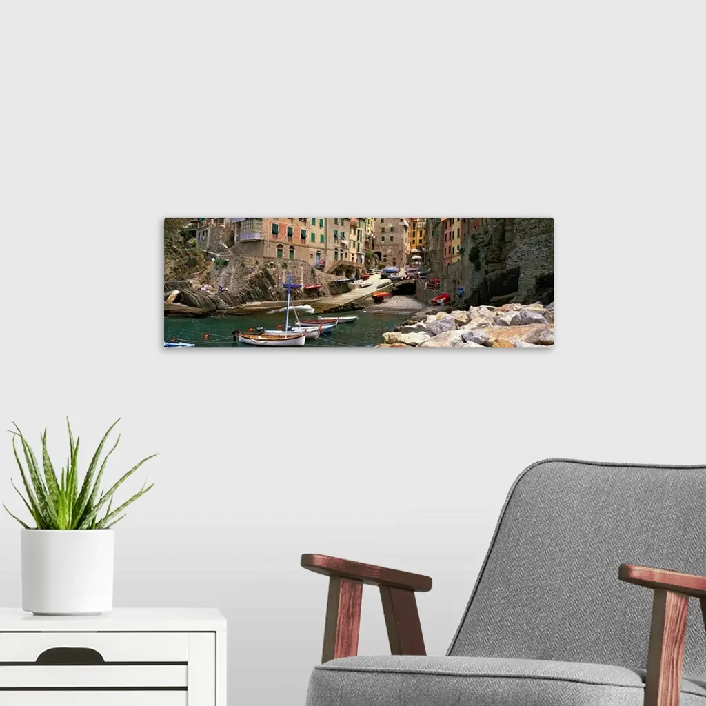 Panoramic photograph showcases a group of small boats sitting and entering an inlet surrounded by steep cliffs and homes within a European country.