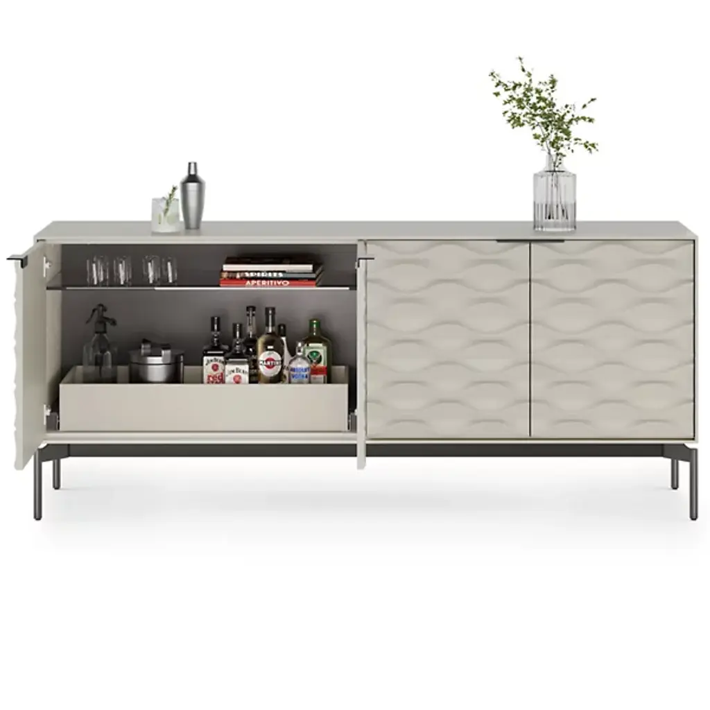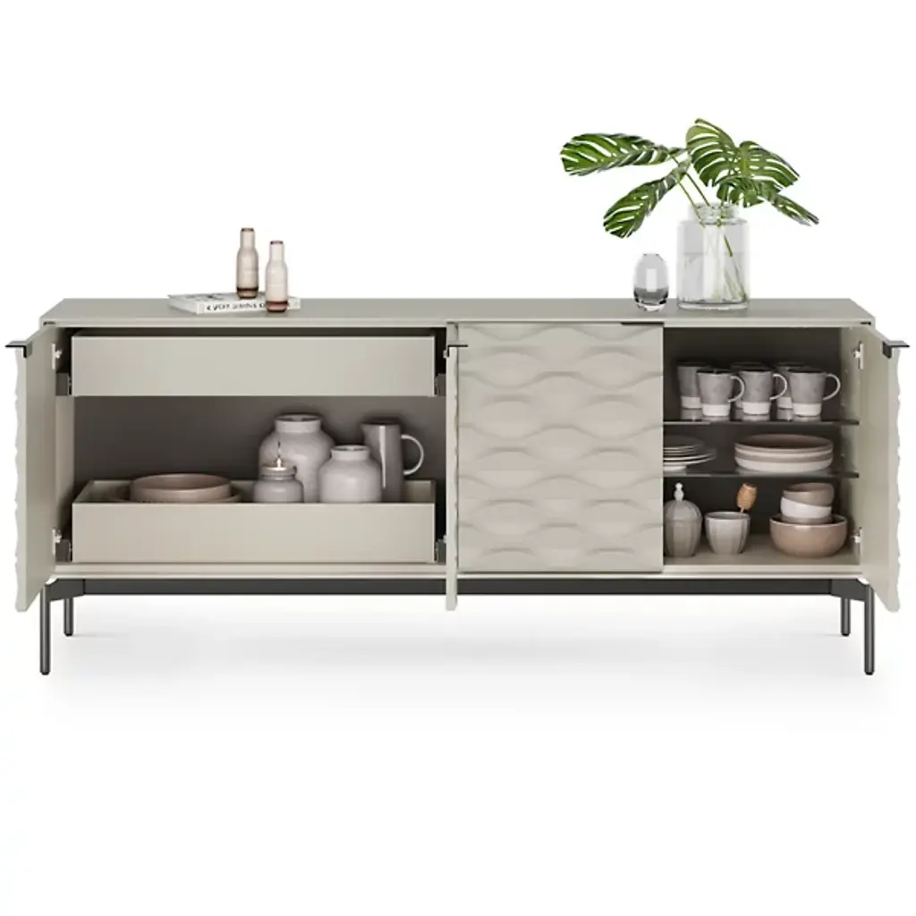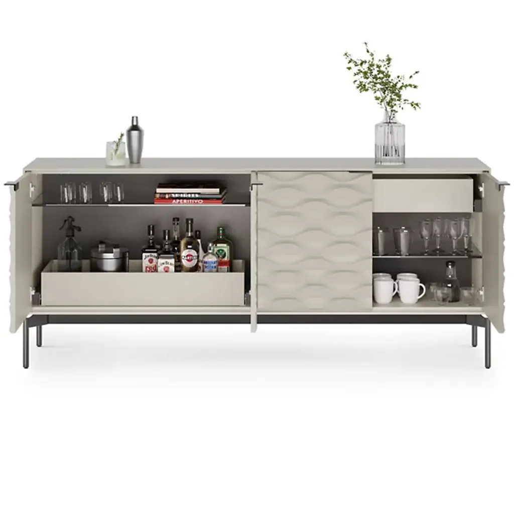 Whether gracing an entryway or serving as a sideboard or credenza, the Ripple Four Door Credenza by BDI embodies modern refinement. This piece effortlessly pairs versatile storage solutions with contemporary sophistication and show-stopping style that features two adjustable storage drawers that can be placed at the top or bottom, transforming into elegant serving trays when needed. It offers ample storage for dinnerware, glassware, and everyday essentials, making it a pinnacle of both form and function in your home.