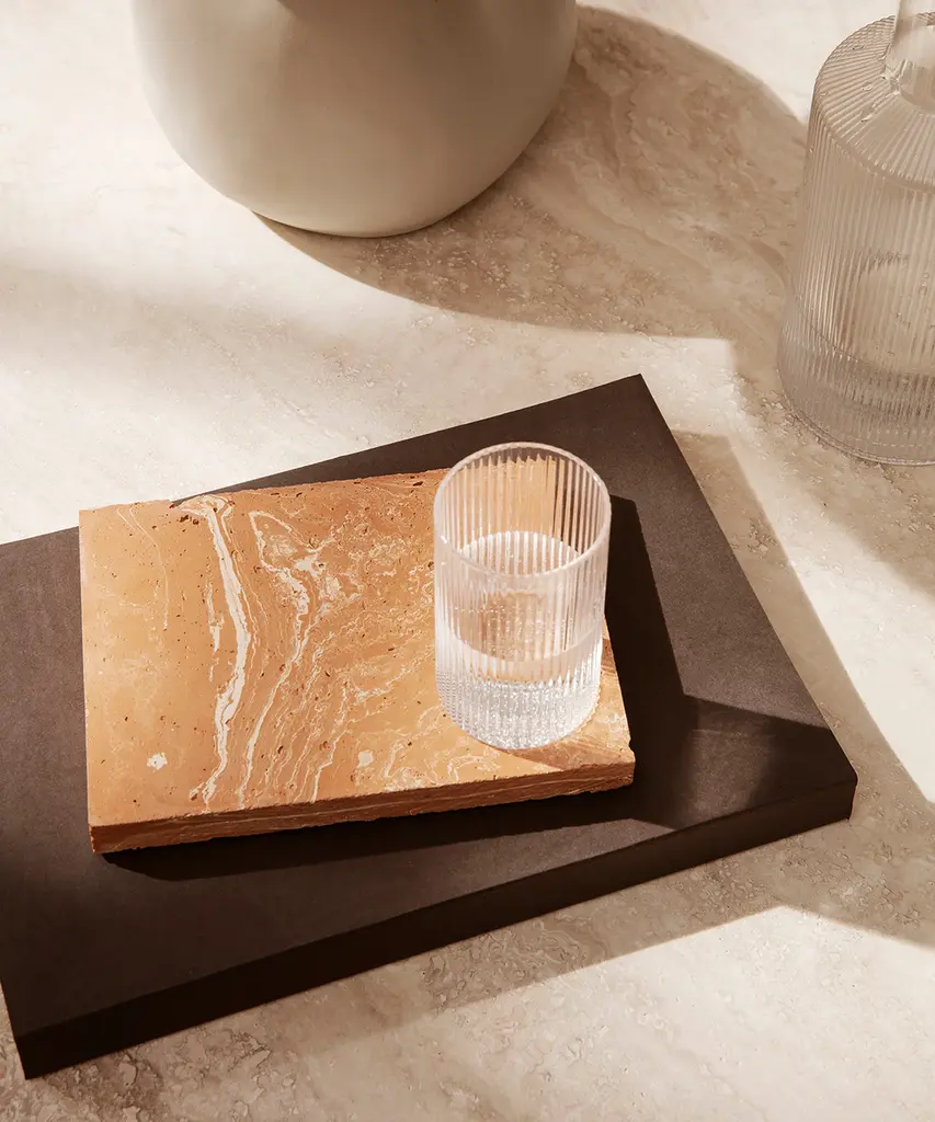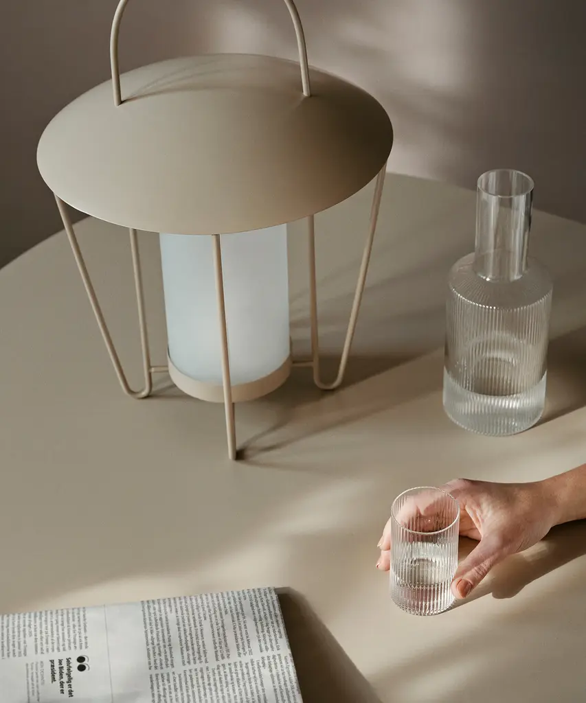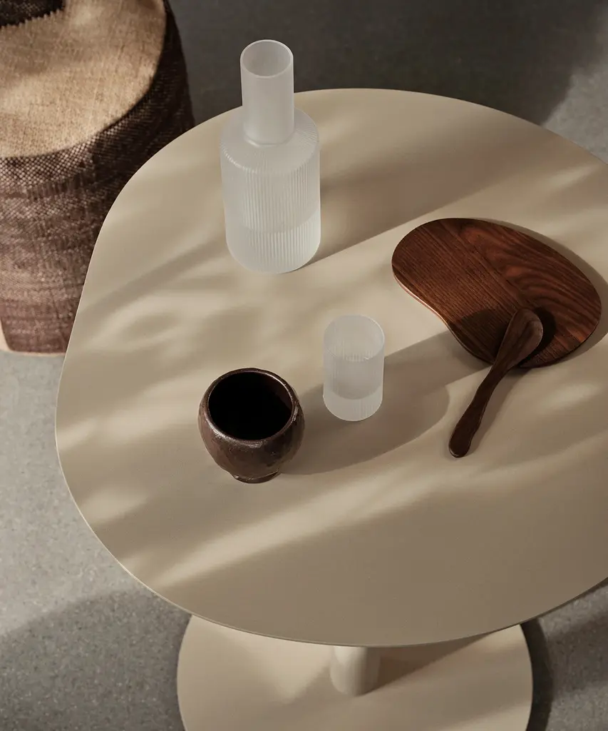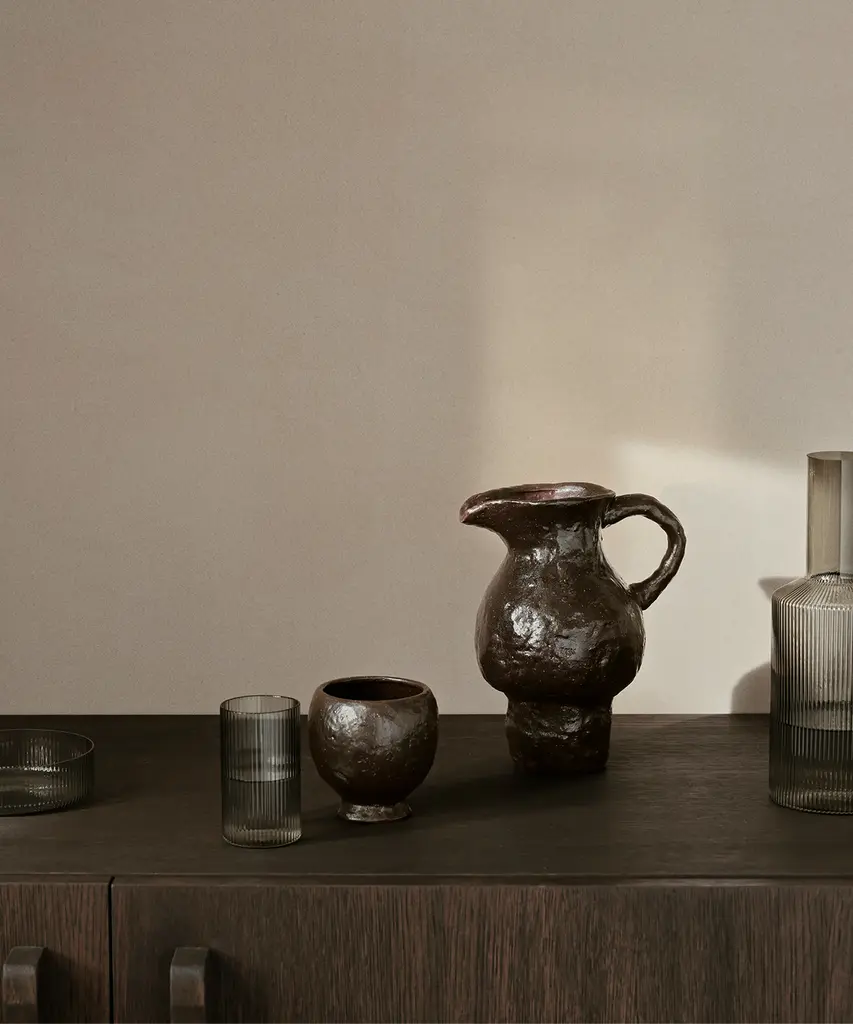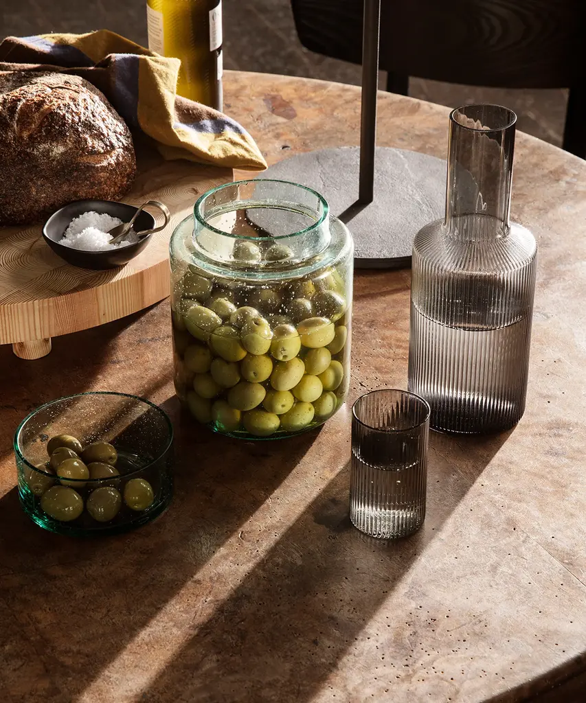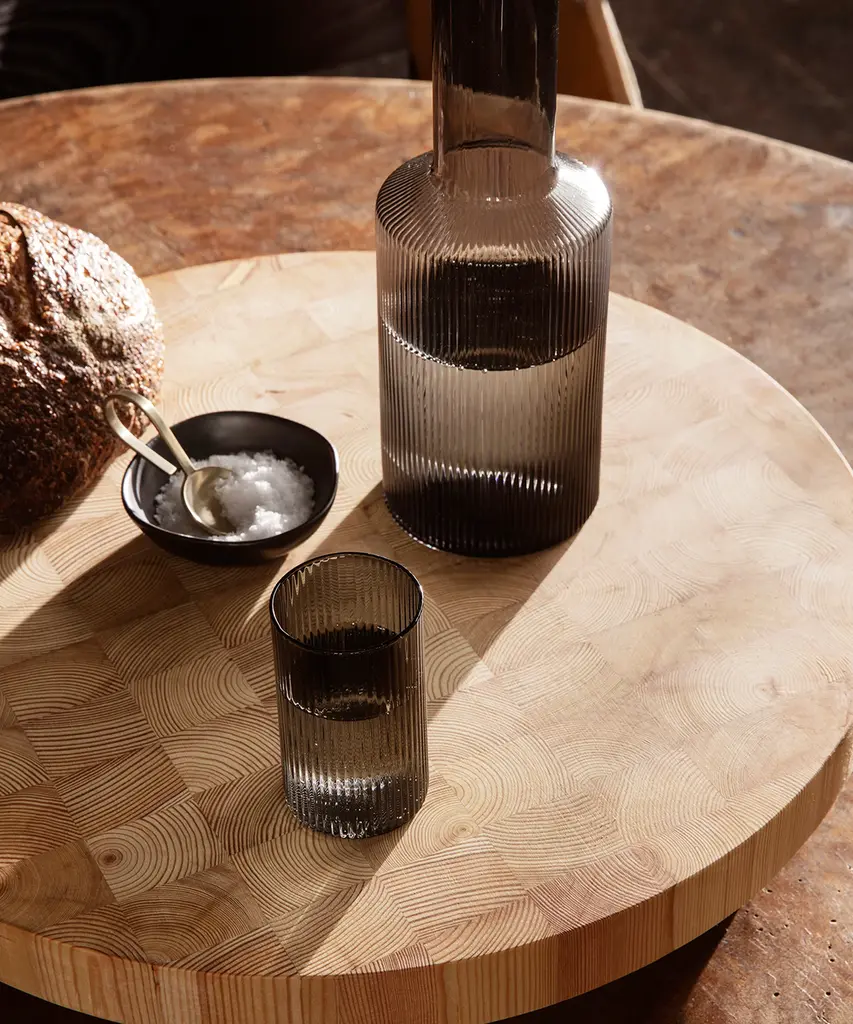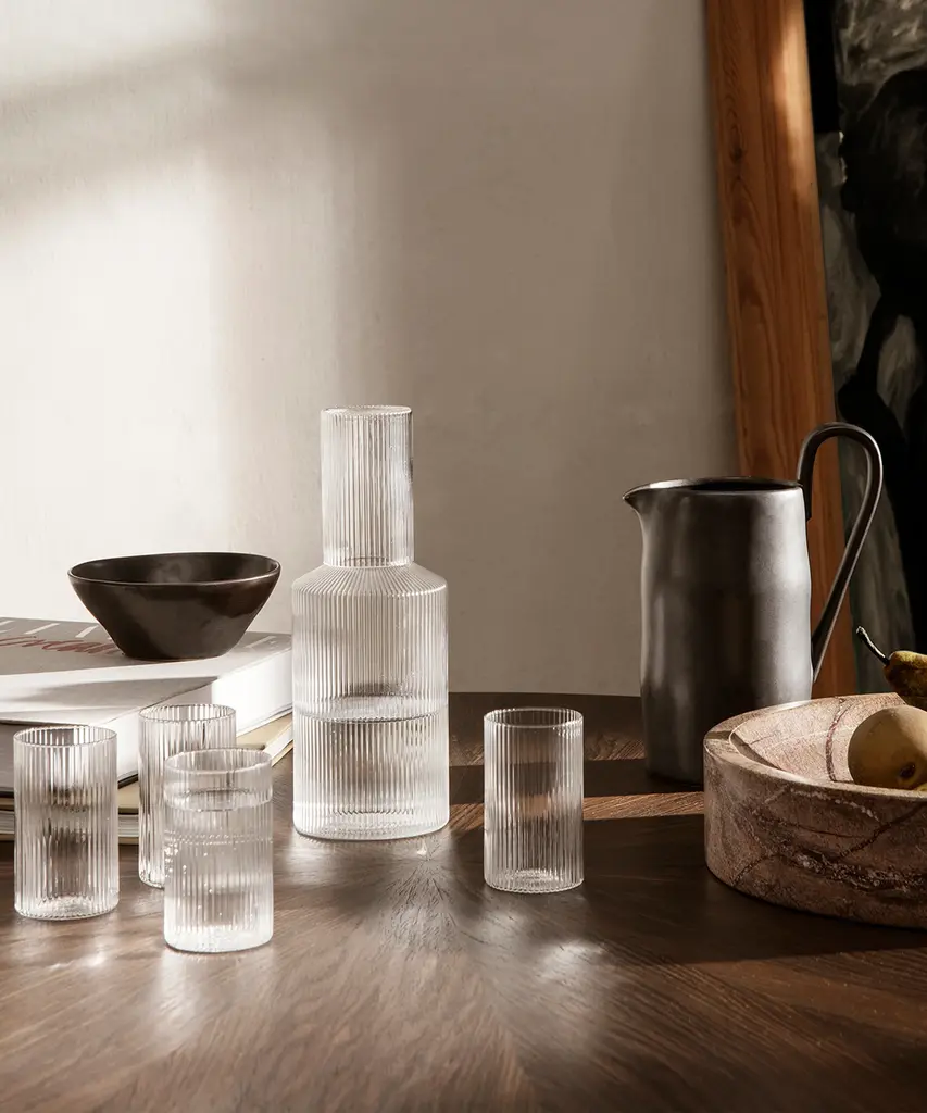 A companion to the Ripple Carafe, this elegant glass functions as both a drinking glass and a lid. Inspired by small, delicate glasses traditionally used in French cuisine to serve little appetizers and desserts, the mouth-blown glass has a rippled surface that is distinctive to the series. Designed and produced by the Copenhagen-based studio Ferm Living.